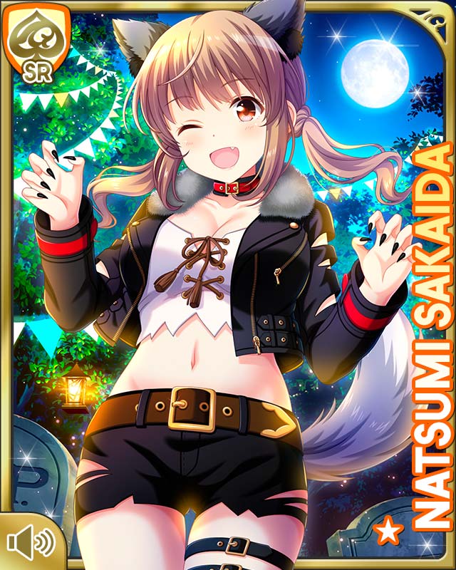 1girl animal_ears belt black_jacket black_shorts breasts brown_hair card_(medium) character_name cleavage collarbone fake_animal_ears fake_tail female_focus full_moon girlfriend_(kari) hair_ornament halloween halloween_costume jacket large_breasts long_hair looking_at_viewer midriff moon navel night official_art one_eye_closed open_mouth outdoors pink_scrunchie qp:flapper red_eyes sakaida_natsumi scrunchie shirt shorts smile solo sparkle standing tail white_shirt wolf_ears wolf_tail