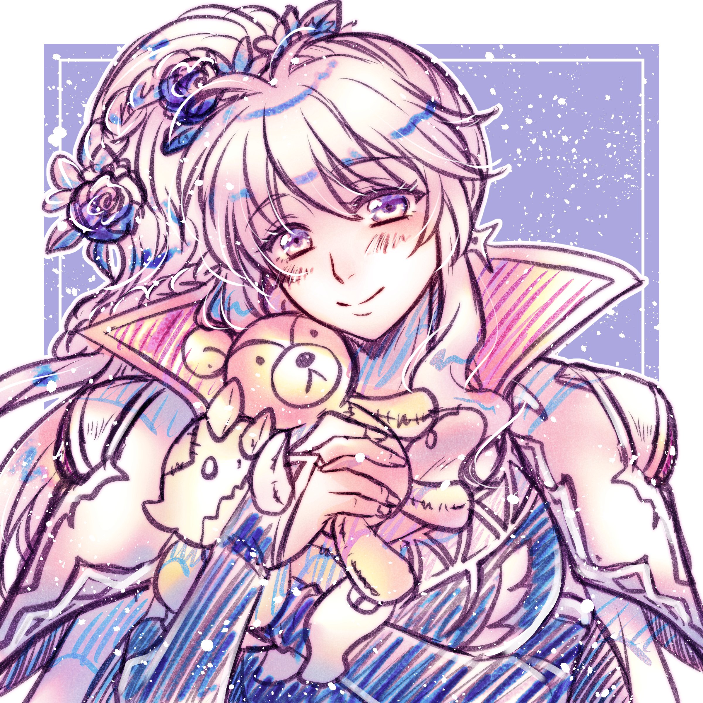 1girl absurdres ao_(yashuring) collar commission commissioner_upload fire_emblem fire_emblem:_genealogy_of_the_holy_war fire_emblem_heroes flower hair_flower hair_ornament highres ishtar_(echoing_thunder)_(fire_emblem) ishtar_(fire_emblem) nintendo skeb_commission smile stuffed_animal stuffed_toy teddy_bear