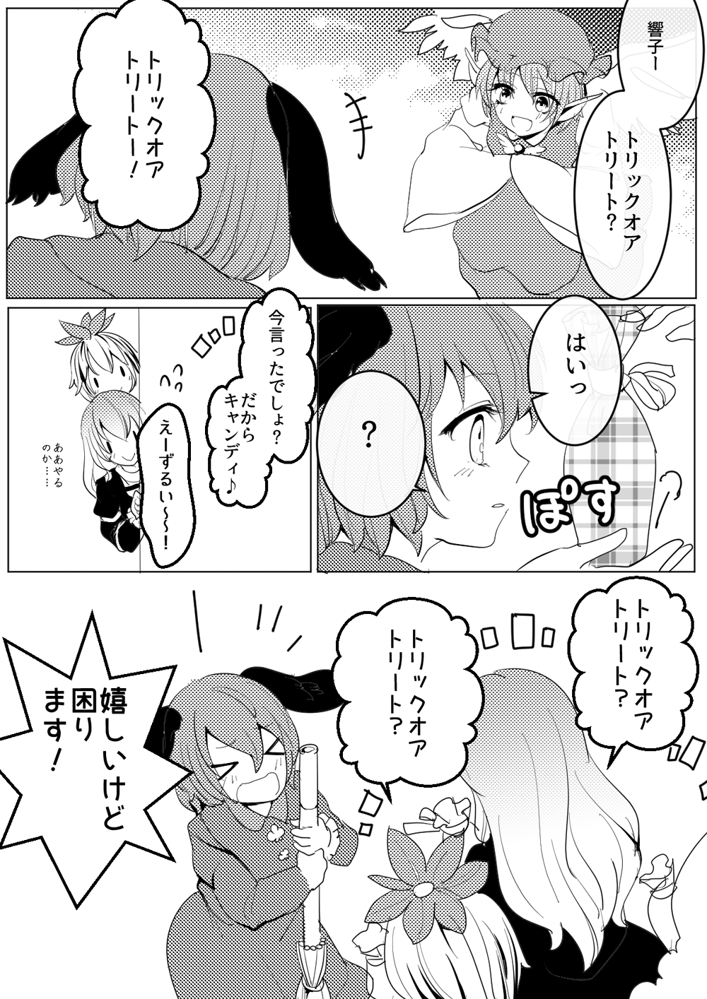 >_< 4girls ? animal_ears bird_ears bird_wings blush broom closed_mouth comic dog_ears dress flying_sweatdrops fumikiri_(dake_no_hito) gradient_hair greyscale hat highres hijiri_byakuren holding holding_broom kasodani_kyouko long_hair long_sleeves monochrome multicolored_hair multiple_girls mystia_lorelei open_mouth short_hair sleeves_past_fingers sleeves_past_wrists smile speech_bubble spoken_question_mark toramaru_shou touhou translation_request two-tone_hair wide_sleeves wings