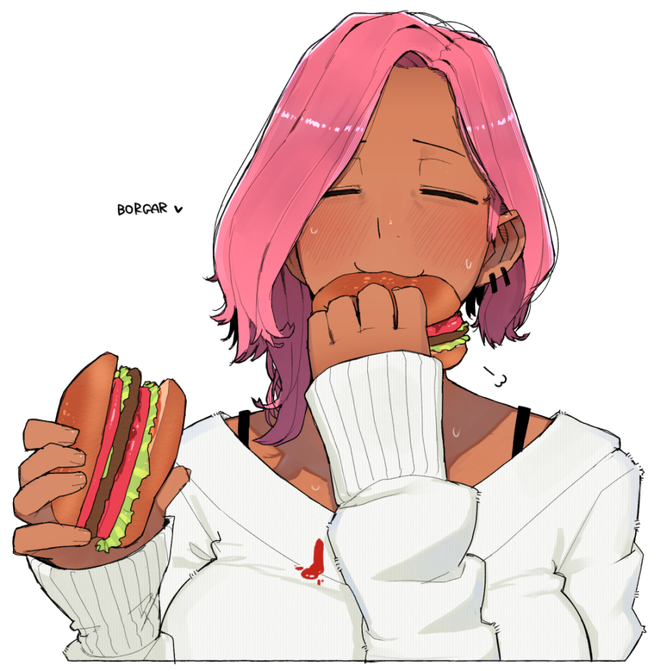 1girl blush breasts burger cleavage dark-skinned_female dark_skin eating english_text food holding holding_food ketchup long_sleeves ohasi original pink_(ohasi) pink_hair short_hair simple_background solo sweat sweater white_background