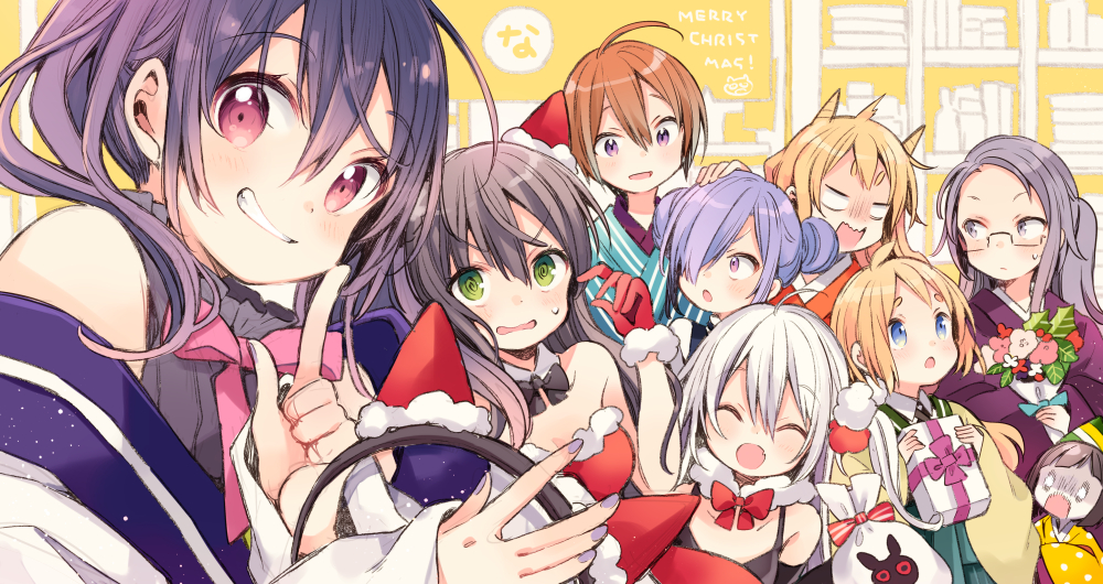 6+girls :o @_@ ahoge black_bow black_bowtie black_shirt blonde_hair blue_eyes blue_hair blue_kimono blush bouquet bow bowtie brown_hair brown_sweater camisole cardigan chiya_(urara_meirochou) closed_eyes closed_mouth collar detached_collar dot_nose double_bun dress empty_eyes finger_to_own_chin flower frilled_collar frills fur-trimmed_dress fur-trimmed_gloves fur_scarf fur_trim gift glasses gloves green_eyes grey_eyes grey_hair grin hair_between_eyes hair_bun hair_over_one_eye hanahara_tsubaki harikamo headpat holding holding_bouquet holding_gift horns iroi_saku japanese_clothes kimono kurou_(urara_meirochou) long_bangs long_hair long_sleeves looking_at_another looking_at_viewer low_ponytail matsuko_(urara_meirochou) medium_hair multiple_girls nail_polish natsume_nina natsume_nono nijou_omi one_eye_covered open_mouth orange_hair pink_bow pink_bowtie pink_eyes ponytail purple_eyes purple_hair purple_kimono purple_nails red_bow red_bowtie red_dress red_gloves ribbed_sweater santa_costume scarf shirt short_hair side_ponytail sidelocks sleeveless sleeveless_shirt sleeveless_sweater smile strapless strapless_dress sweat sweater tatsumi_kon thick_eyebrows turtleneck turtleneck_sweater twintails urara_meirochou v-shaped_eyebrows white_hair white_scarf yellow_cardigan yukimi_koume