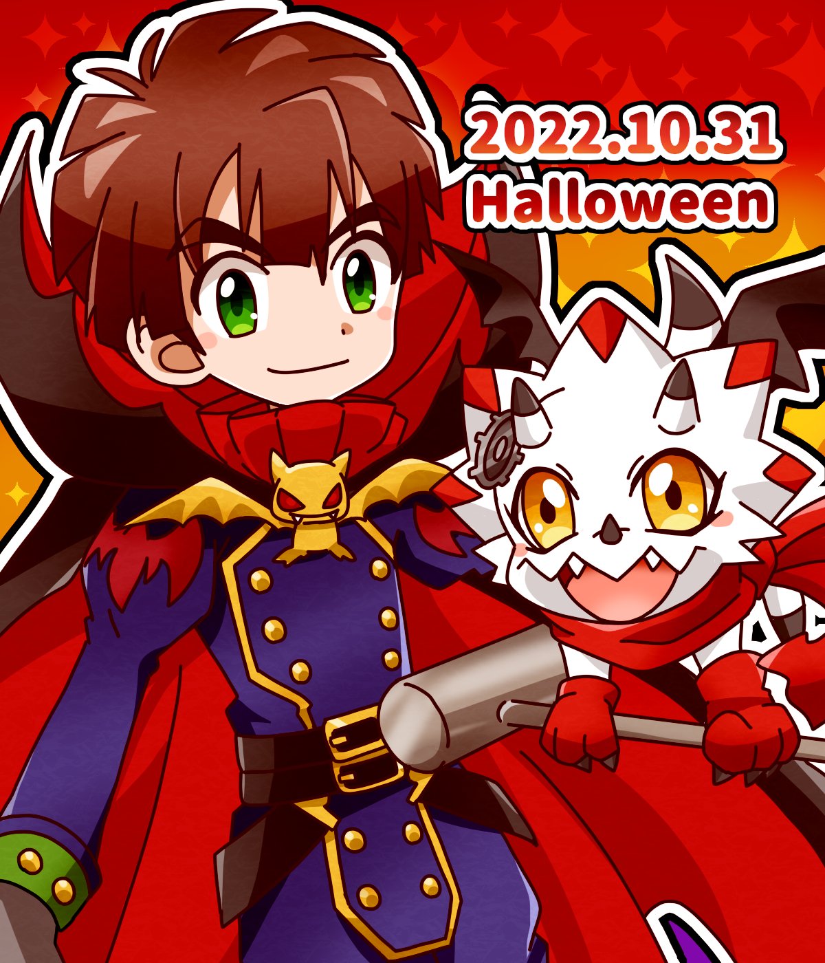 2boys amanokawa_hiro belt brown_hair clockmon clockmon_(cosplay) cosplay dated digimon digimon_ghost_game dinosaur gammamon green_eyes halloween halloween_costume highres looking_at_viewer multiple_boys short_hair vamdemon vamdemon_(cosplay)