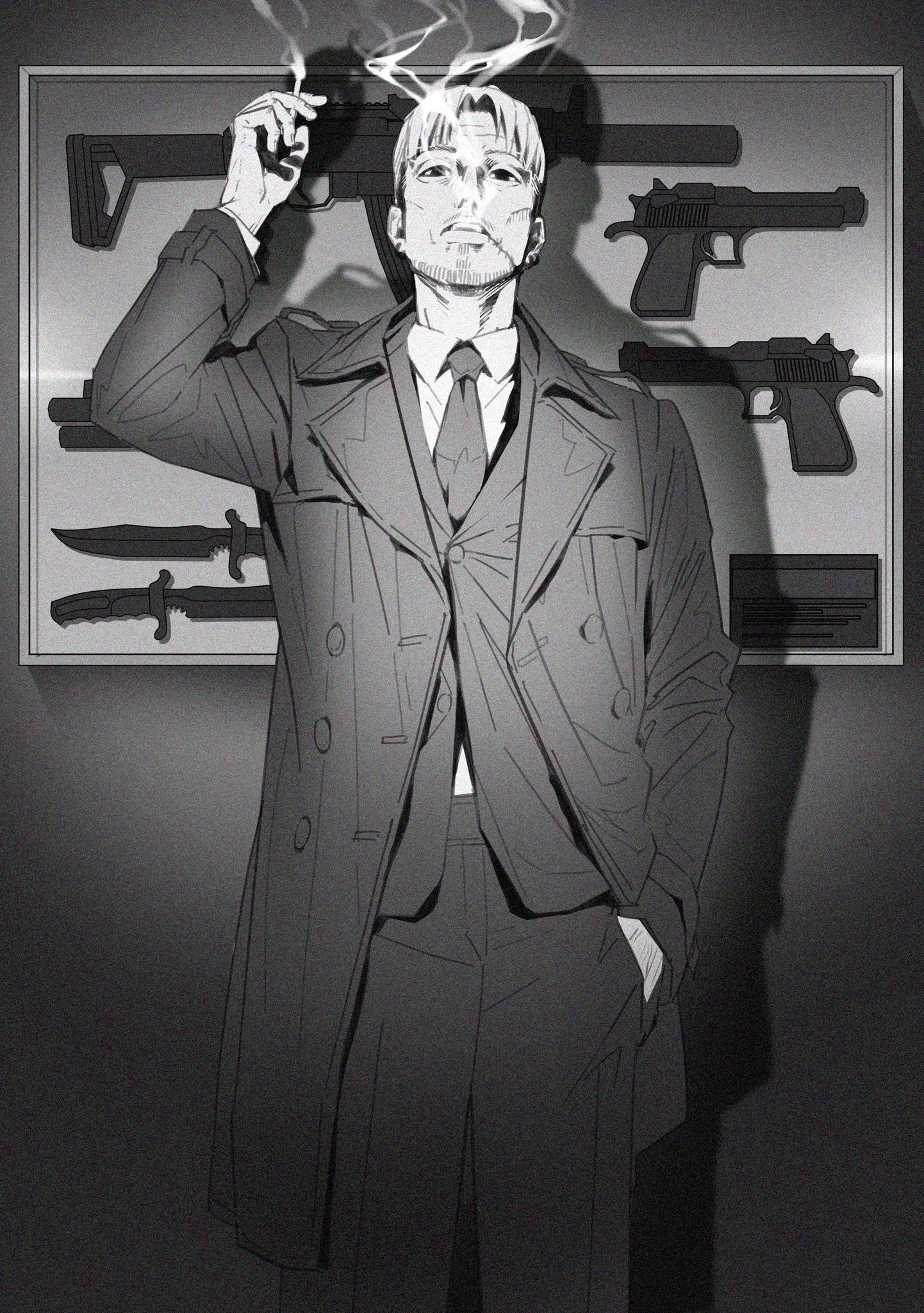 1boy battle_rifle beard black_coat black_jacket black_necktie chainsaw_man cigarette coat earrings facial_hair facial_scar formal_clothes grey_background greyscale gun hand_in_pocket handgun highres holding holding_cigarette jacket jewelry kishibe_(chainsaw_man) knife looking_at_viewer looking_up m14 monochrome multiple_earrings necktie personal_defense_weapon pp-19-01_vityaz rifle scar scar_on_cheek scar_on_face short_hair shotgun smoke smoking solo stitched_face stitched_mouth stitches stubble submachine_gun suit take_bayashi_3d weapon weapon_on_wall white_hair