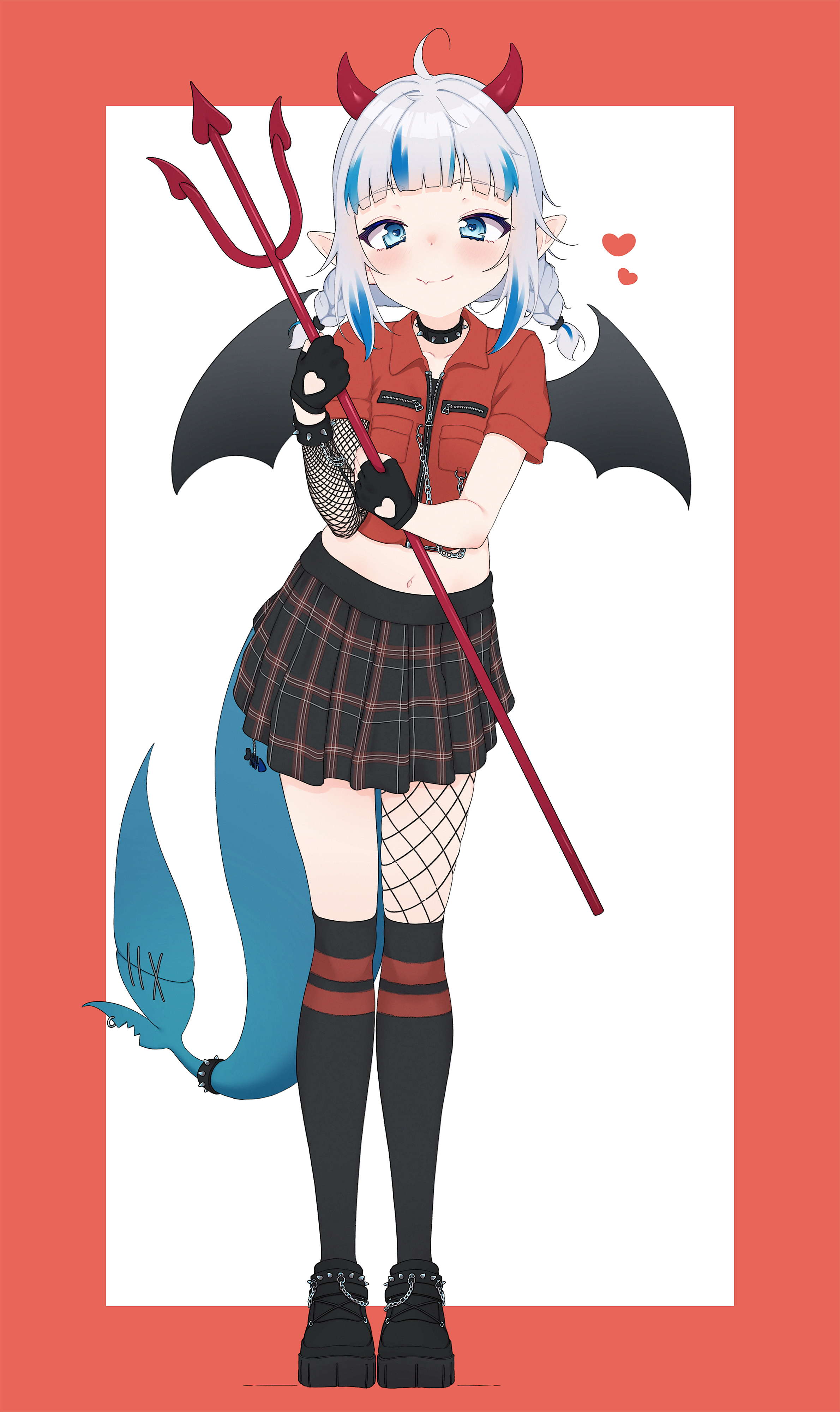 1girl absurdres ahoge asymmetrical_legwear bat_wings blue_eyes blue_hair bracelet braid collar demon_horns fang fingerless_gloves fins fish_tail fishnet_sleeves fishnets full_body gawr_gura gloves heart heart-shaped_pupils highres hololive hololive_english horns jewelry looking_at_viewer lucasyecla99 midriff multicolored_hair navel pitchfork plaid_clothes plaid_skirt pointy_ears red_shirt shark_girl shark_tail shirt simple_background skin_fang skirt smile solo spiked_bracelet spiked_collar spikes symbol-shaped_pupils tail twin_braids two-tone_background virtual_youtuber white_hair wings
