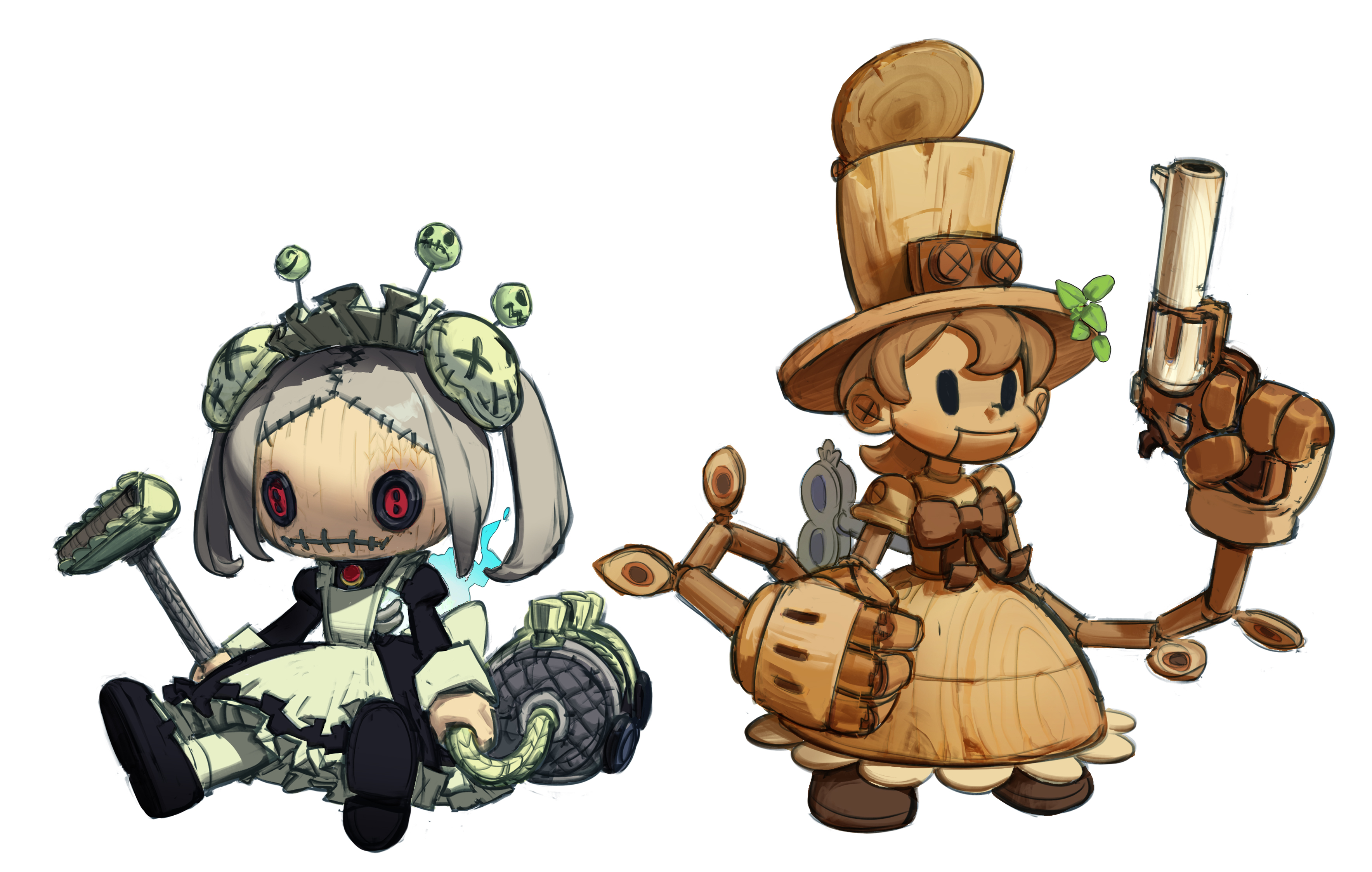 2girls absurdres bloody_marie_(skullgirls) doll dress frilled_dress frills green_hair gun handgun hat highres maid_headdress multiple_girls peacock_(skullgirls) pistol red_eyes revolver samuelyounart sitting skullgirls stitched_mouth stitches top_hat toy twintails vacuum_cleaner weapon winding_key wind_up_key