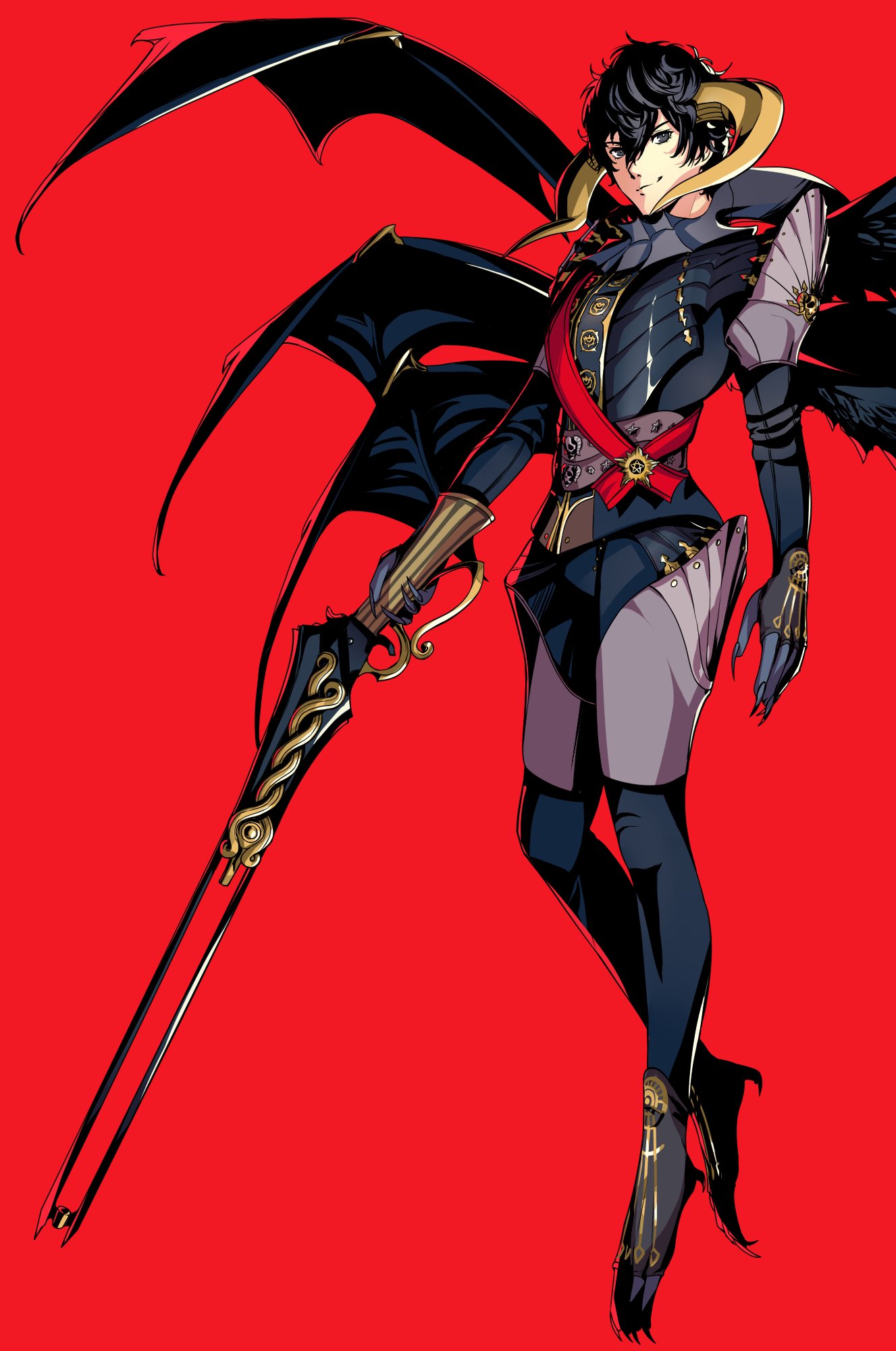 alternate_costume amamiya_ren black_hair commentary english_commentary eyelashes gun happy highres looking_at_viewer pancakesorting persona persona_5 persona_5_the_royal red_background short_hair simple_background smile solo standing weapon