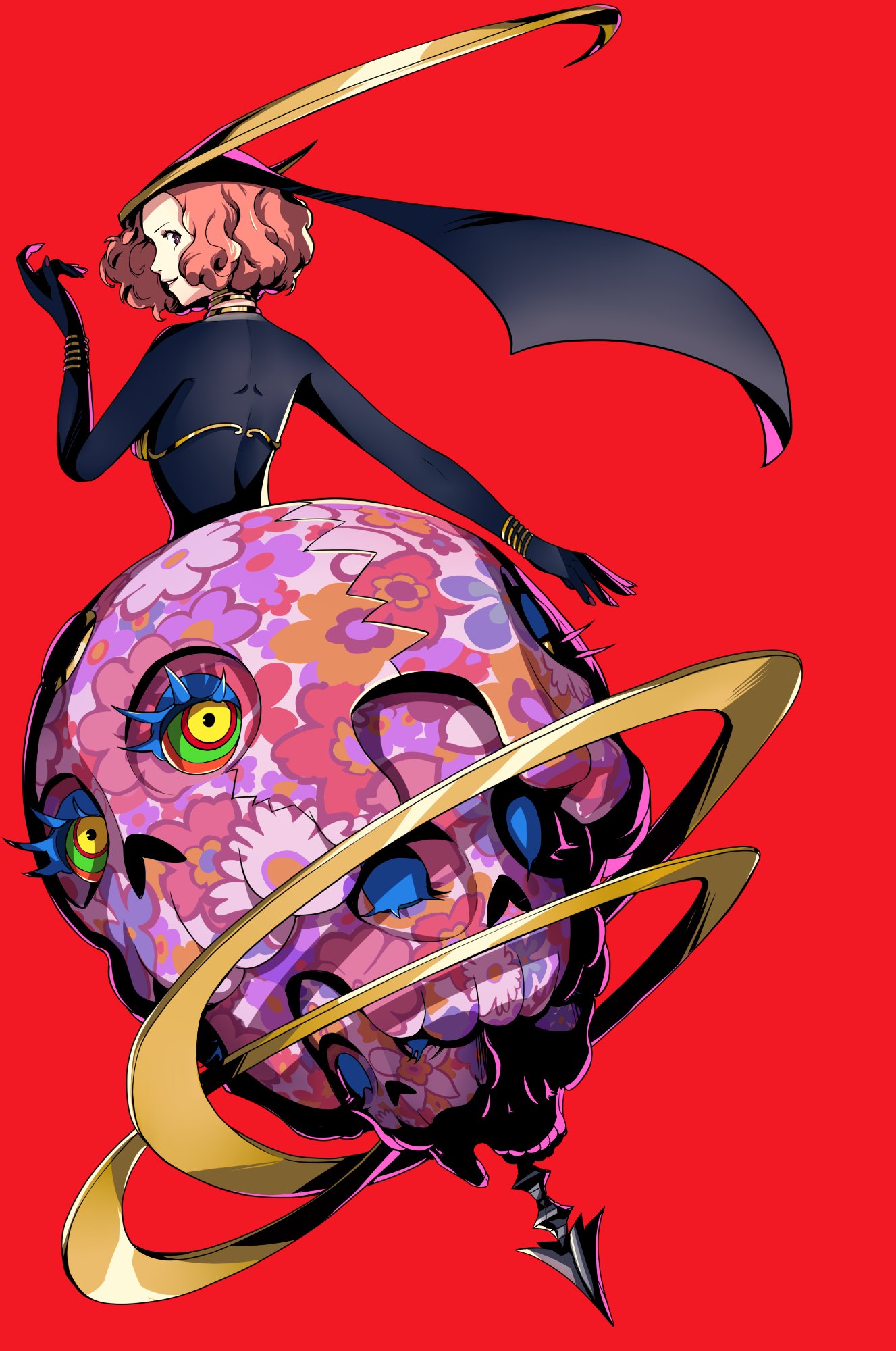 1girl alternate_costume black_bodysuit bodysuit bracelet brown_eyes commentary eyelashes happy highres jewelry looking_back okumura_haru pancakesorting persona persona_5 persona_5_the_royal red_background short_hair simple_background smile solo