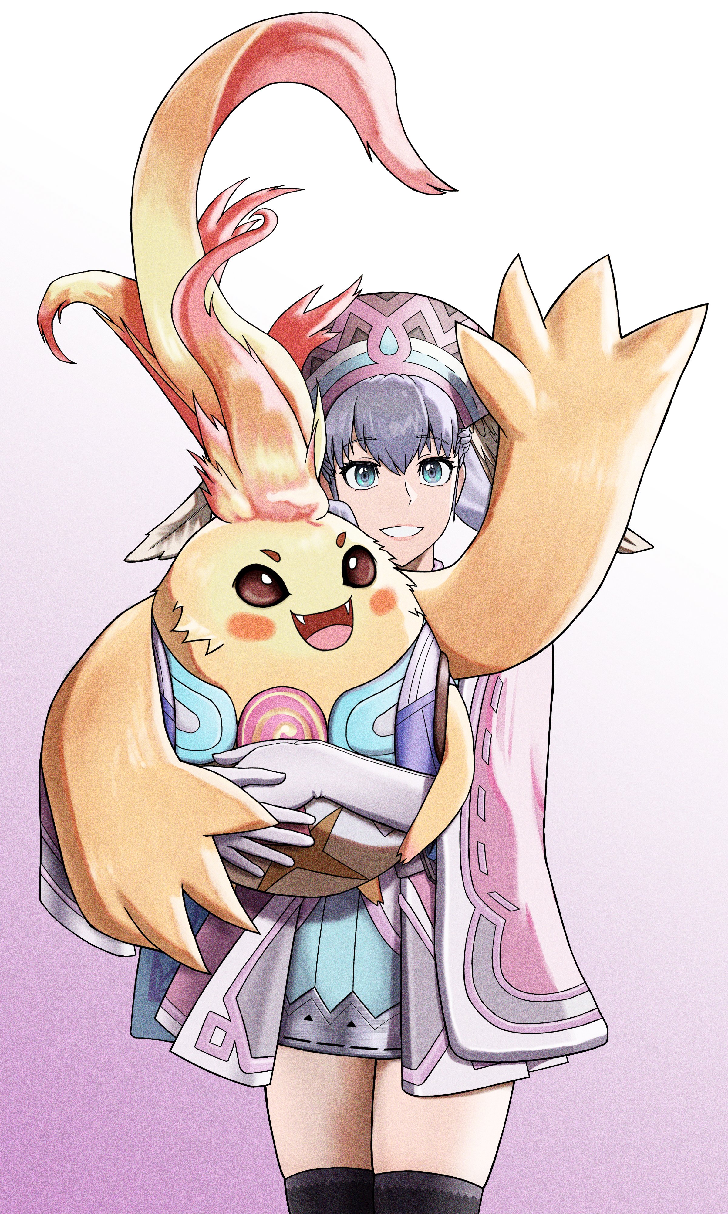 1girl :d absurdres black_boots blue_eyes boots dress elbow_gloves gloves grey_hair grin highres long_hair long_sleeves looking_at_viewer mahyohan melia_antiqua open_mouth pink_background pink_dress smile solo teeth thigh_boots white_gloves xenoblade_chronicles_(series) xenoblade_chronicles_1