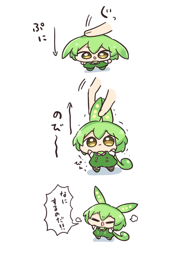 1girl chibi green_hair mini_person minigirl nontao pulling squishing translated voicevox yellow_eyes zundamon