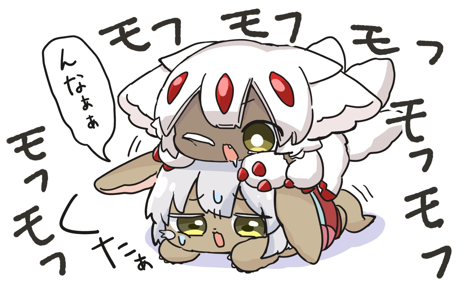 1girl 1other animal_ears chibi drooling faputa furry highres lying lying_on_person made_in_abyss nanachi_(made_in_abyss) nontao on_stomach one_eye_closed simple_background translated white_background white_hair yellow_eyes
