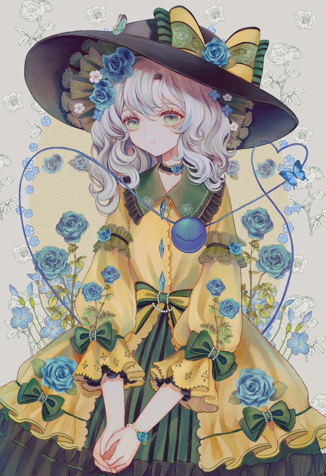 1girl black_hat blue_flower blue_rose buttons collared_shirt diamond_button eyeball flower frilled_shirt_collar frills green_eyes green_skirt grey_hair hat hat_ribbon heart heart_of_string highres hourai_kiriri komeiji_koishi long_sleeves medium_hair parted_lips ribbon rose shirt skirt solo third_eye touhou upper_body yellow_ribbon yellow_shirt