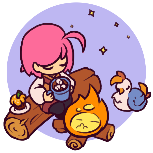 1girl ahoge alpha_transparency animal annamaria_klimkovich bird black_pants blue_background brown_vest campfire chibi chicken closed_eyes commentary cup cupcake fire food gail_(phoenotopia) holding holding_cup hot_chocolate log long_sleeves no_nose pants phoenotopia:_awakening pink_hair rooster second-party_source short_hair sitting sitting_on_log solo sparkle swept_bangs vest white_sleeves