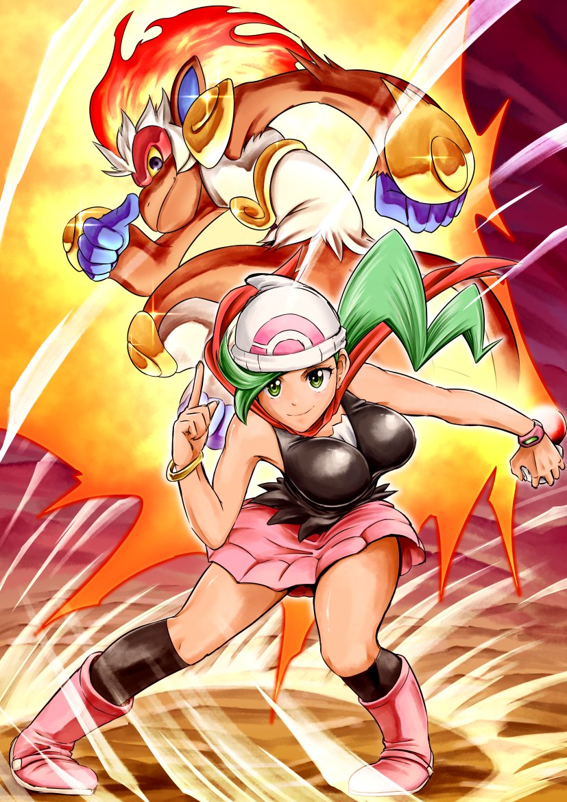 1girl breasts cosplay dawn_(pokemon) dawn_(pokemon)_(cosplay) gen_3_pokemon gen_4_pokemon green_hair hat ihara_shigekatsu infernape long_hair looking_at_viewer milotic miniskirt mitsumi_(pokemon) nintendo pokemon pokemon_dp_(manga) pokemon_diamond/pearl/platinum skirt smile solo tagme thick_thighs thighs watch wide_hips