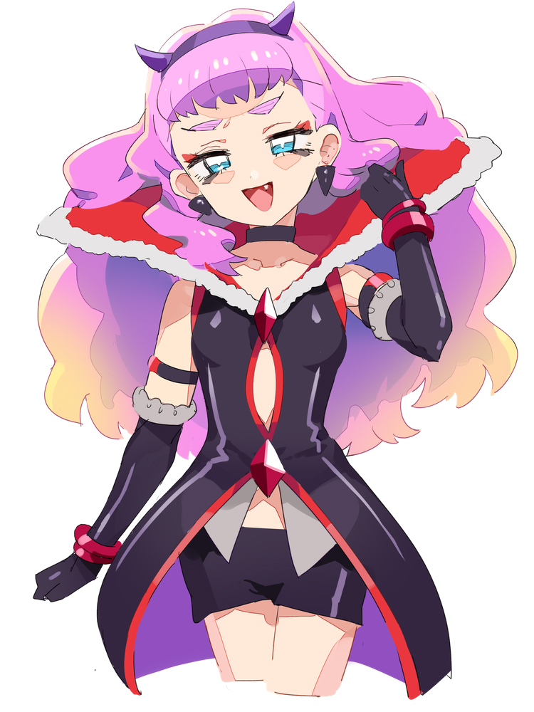 1girl armlet black_choker black_dress black_gloves black_shorts blue_eyes blue_horns blunt_bangs bracelet choker commentary cosplay cropped_legs demon_horns dress earrings eas_(cosplay) eas_(precure) elbow_gloves eyeliner fake_horns fang fresh_precure! gem gloves gradient_hair halloween halloween_costume hand_in_own_hair horns in-franchise_crossover jewelry laura_la_mer long_hair looking_at_viewer makeup mascara moudoku_(decopon3rd) multicolored_hair open_mouth precure purple_hair in-franchise_crossover short_dress short_shorts shorts simple_background smirk smug solo spiked_armlet standing textless_version tropical-rouge!_precure white_background