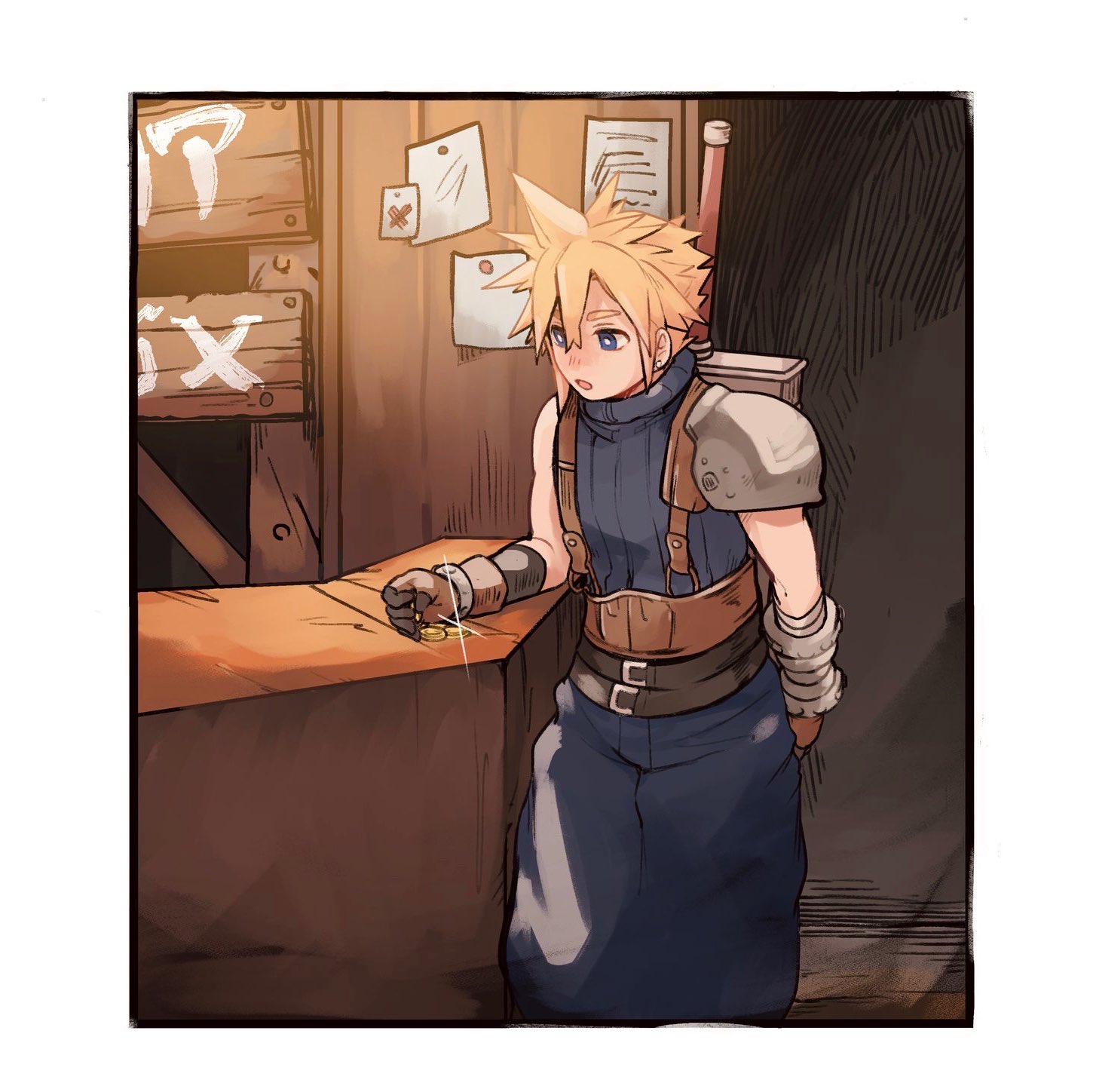 1boy armor baggy_pants belt blonde_hair blue_eyes blue_pants blue_shirt border buster_sword cloud_strife coin cowboy_shot crossed_bangs final_fantasy final_fantasy_vii final_fantasy_vii_remake gloves hair_between_eyes highres indoors male_focus multiple_belts open_mouth pants shirt shopping short_hair shoulder_armor sleeveless sleeveless_shirt solo spiked_hair suspenders tasituma2 weapon weapon_on_back