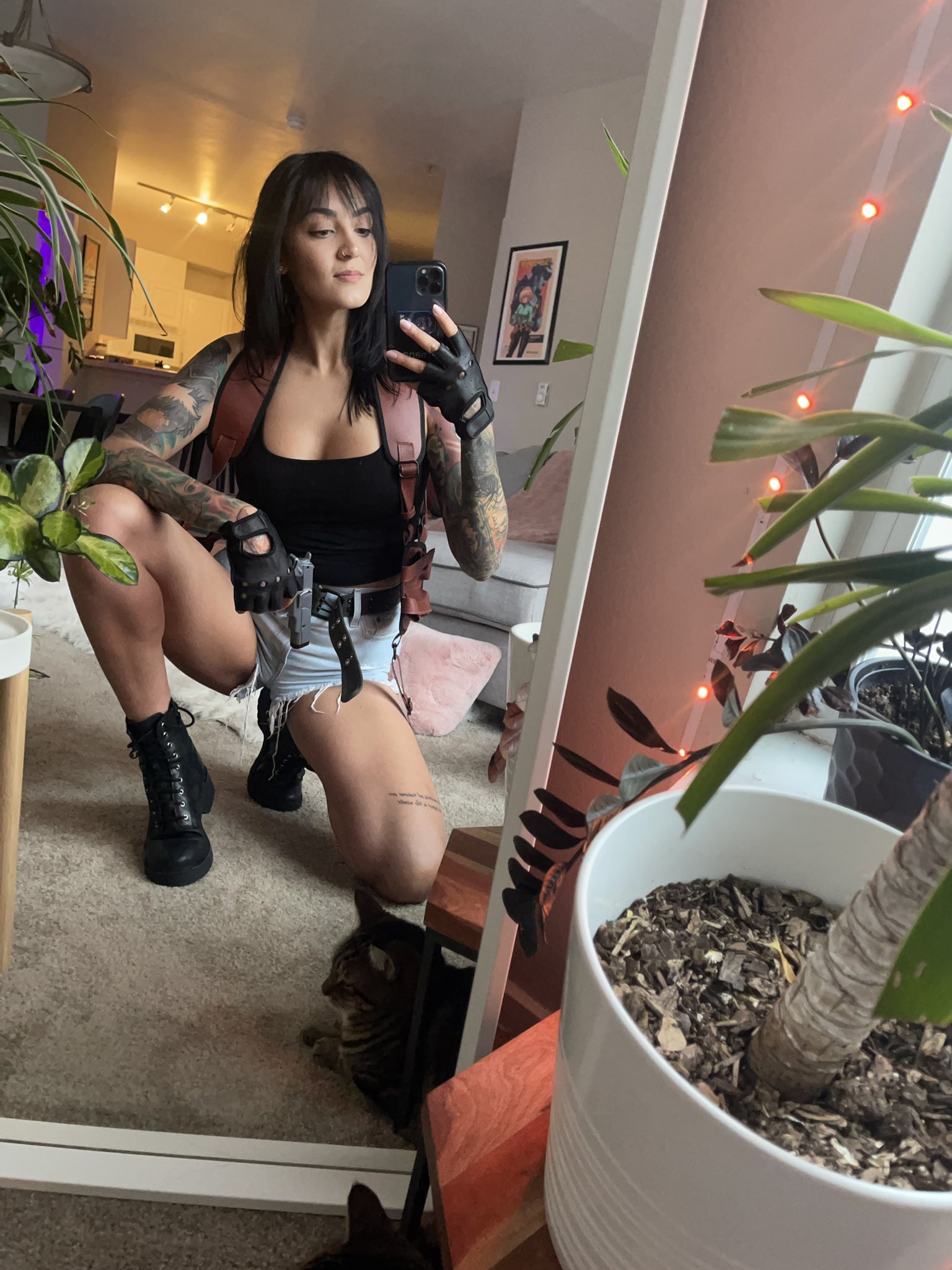 1girl black_hair black_lagoon breasts brown_eyes cat cellphone cleavage cosplay denim denim_shorts earrings face_piercing fingerless_gloves gloves gun handgun highres holster iphone jewelry legs nose_piercing phone photo_(medium) piercing plant revy_(black_lagoon) revy_(black_lagoon)_(cosplay) selfie shorts smartphone tattoo thighs weapon wisalallen