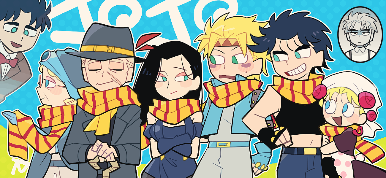 3girls 5boys aqua_eyes bandana battle_tendency belt black_hair black_jacket blonde_hair blue_eyes bow bowtie caesar_anthonio_zeppeli cane crossed_arms dio_brando erina_pendleton facial_mark facial_scar fingerless_gloves gloves green_eyes headband jacket jojo_no_kimyou_na_bouken jonathan_joestar joseph_joestar joseph_joestar_(young) lisa_lisa midriff multiple_boys multiple_girls navel old old_man old_woman phantom_blood red_bow red_bowtie robert_e._o._speedwagon scar scar_on_cheek scar_on_face scarf striped_clothes striped_scarf suzi_q traditional_bowtie tsunoji white_bandana