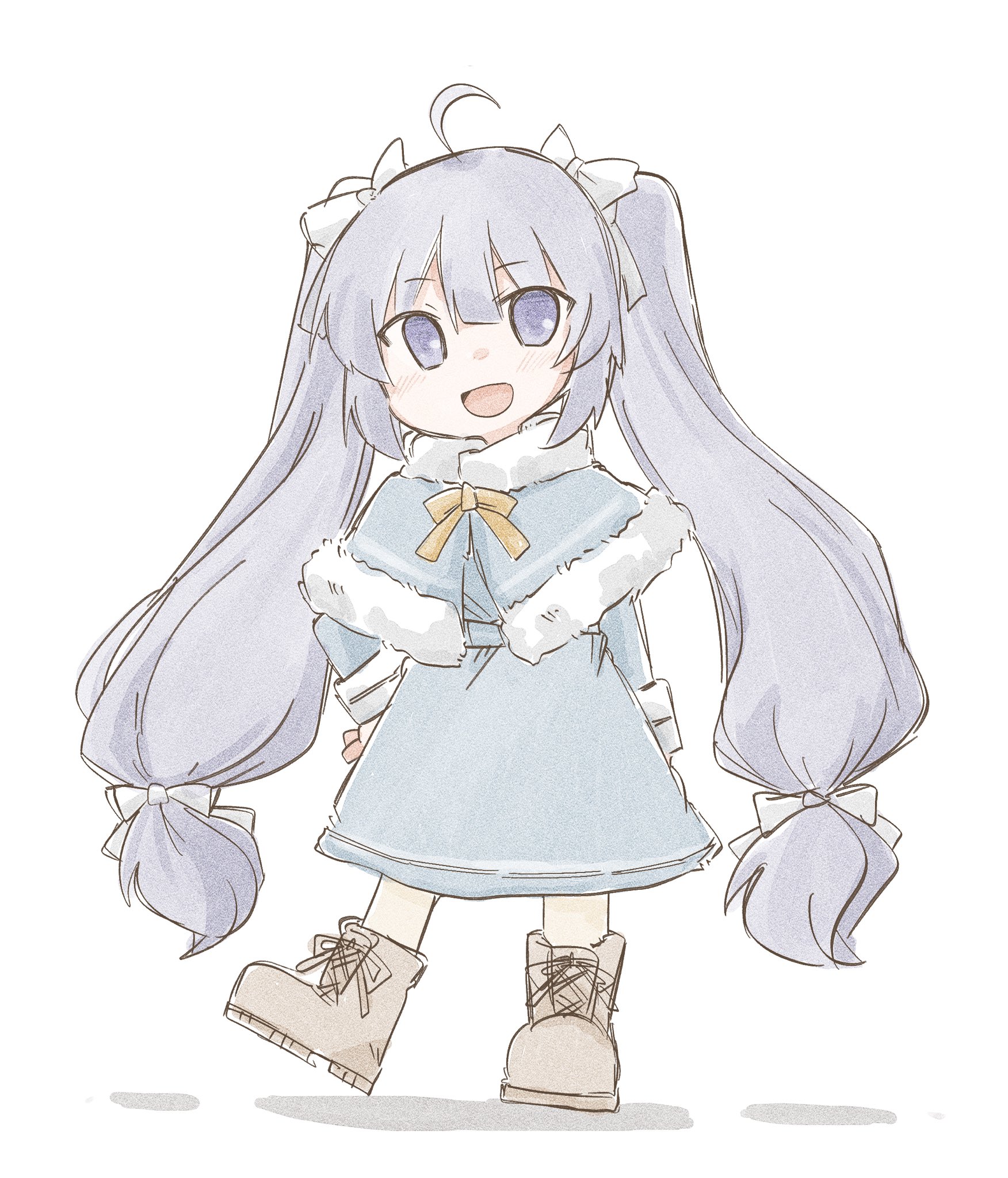 1girl :d ahoge arm_at_side assault_lily blue_capelet blue_dress blunt_bangs boots bow brown_boots capelet commentary dress full_body fur-trimmed_capelet fur_trim grey_hair hair_between_eyes hair_bow hand_on_own_hip highres lace-up_boots light_blush long_hair long_sleeves looking_at_viewer miriam_hildegard_von_gropius neck_ribbon no_pupils open_mouth ribbon simple_background smile solo standing toyo_(sameden46) twintails very_long_hair white_background white_bow winter_clothes yellow_ribbon