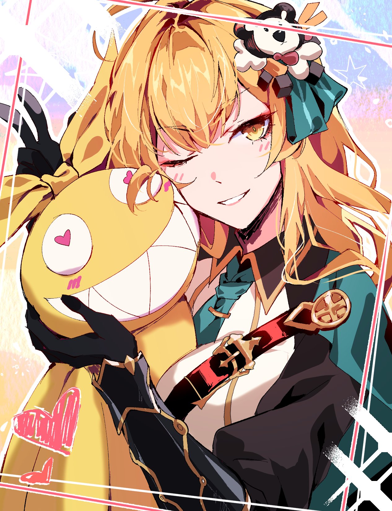1girl :d aer007580 ahoge black_gloves black_jacket blonde_hair bow cape doll gloves green_cape grin hair_bow hair_ornament highres homu_(honkai_impact) honkai_(series) honkai_impact_3rd jacket long_hair long_sleeves looking_at_viewer one_eye_closed open_mouth smile solo susannah_manatt susannah_manatt_(immortal_blades_uniform) susannah_manatt_(valkyrie_quicksand) teeth v yellow_eyes