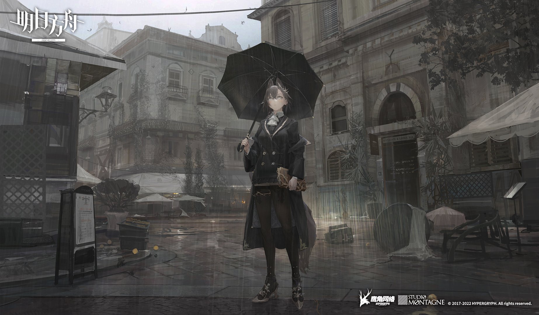 1girl animal_ears arknights ascot book building chair cloud cloudy_sky coat collared_shirt crossed_bangs highres holding holding_book holding_umbrella hypergryph_(arknights) outdoors paindude penance_(arknights) rain scenery shirt sign sky standing table tent umbrella window