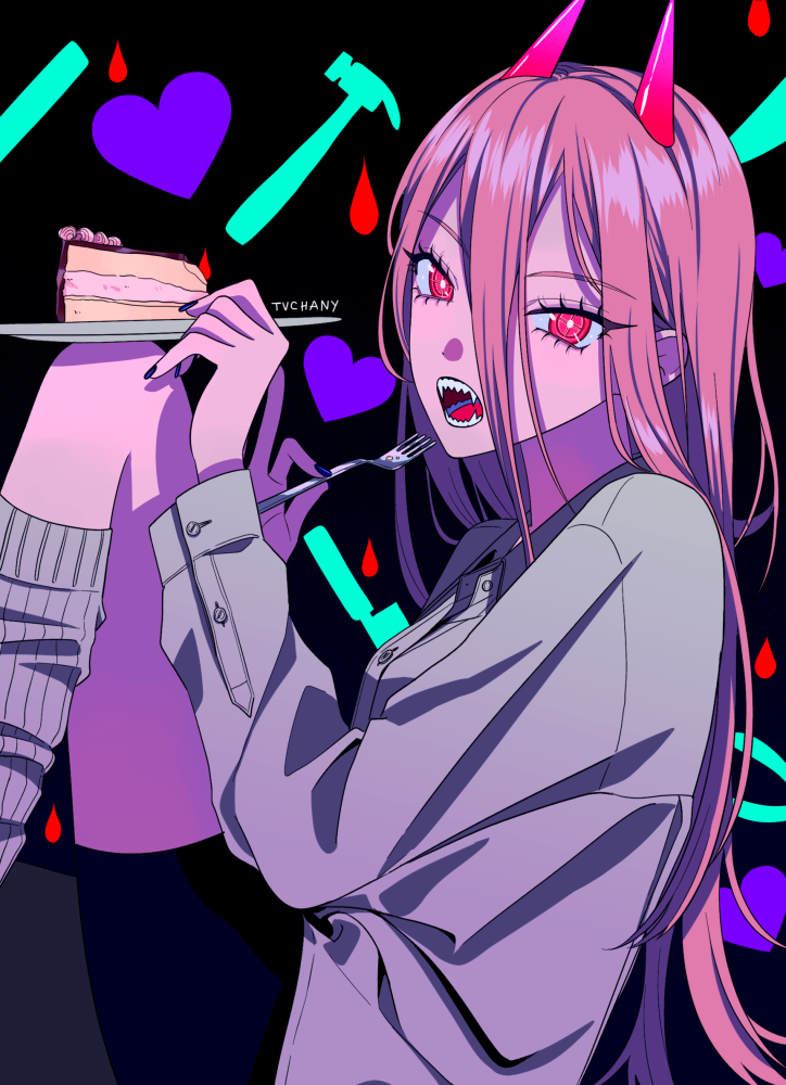 1girl artist_name black_nails black_shorts blood blood_drop buttons cake cake_slice chainsaw_man collared_shirt commentary demon_horns feet_out_of_frame fingernails food fork hair_between_eyes hammer heart holding holding_fork holding_plate horns long_hair long_sleeves looking_at_viewer myon_(tokipi) nail_polish pink_eyes pink_hair plate power_(chainsaw_man) shirt shorts socks solo very_long_hair white_shirt white_socks