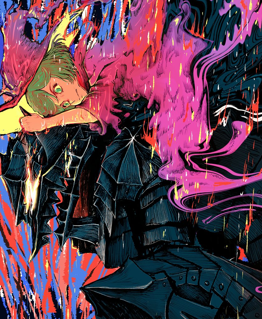 1boy 1girl armor berserk berserker_armor commentary_request glowing glowing_eyes green_eyes green_hair guts_(berserk) hat looking_at_another nisino2222 schierke_(berserk) shoulder_armor witch witch_hat