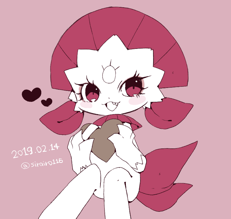1girl :3 alternate_color alternate_shiny_pokemon animal_ears animal_hands artist_name body_fur candy chocolate chocolate_heart claws dated fangs female_focus flat_chest food forehead_jewel furry furry_female gem gen_4_pokemon hands_up happy heart holding holding_food knees_up looking_at_viewer monochrome multiple_tails nintendo open_mouth pink_background pink_eyes pokemon pokemon_(creature) shira_(sirairo116) signature simple_background sitting smile solo tail twitter_username two_tails valentine weavile white_fur white_gem