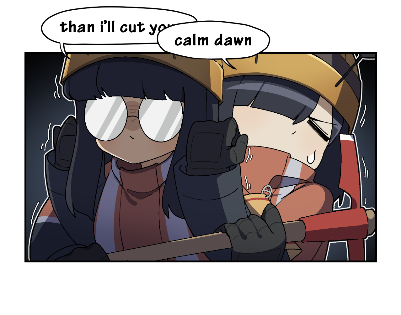 2girls 4koma ant_girl antennae arthropod_girl black_gloves black_hair closed_eyes comic english_text glasses_ant_(gomulgong) gloves hair_over_one_eye helmet holding holding_pickaxe junkzero multiple_girls original outline pickaxe segmented_comic speech_bubble tired_ant_(gomulgong) white_outline