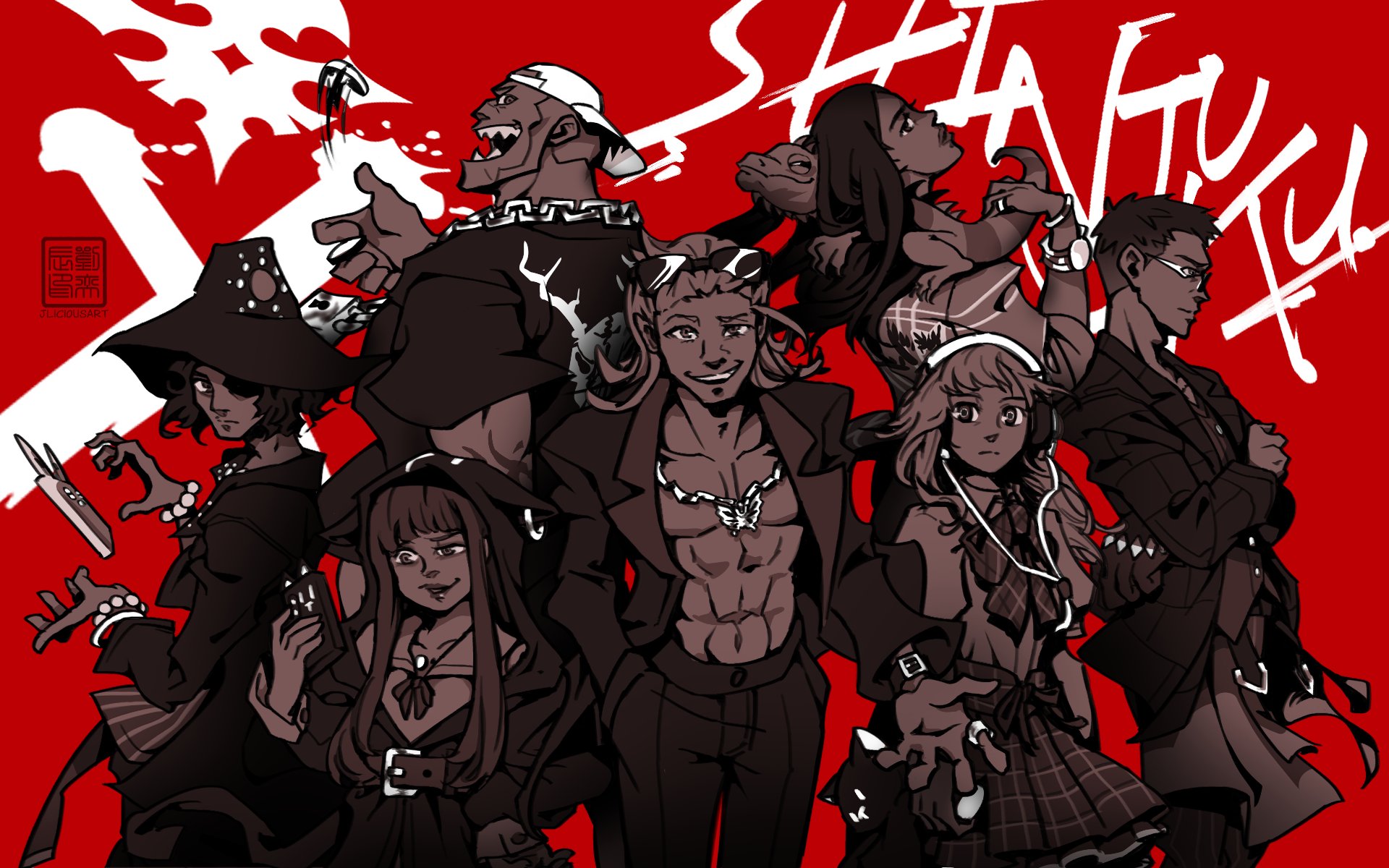 3girls 4boys abs animal animal_ears animal_hood animal_on_shoulder ayano_(ntwewy) backwards_hat baseball_cap black_hair black_headwear black_jacket butterfly_necklace cat_hood cellphone fake_animal_ears glasses grin hat hat_over_one_eye headphones highres hime_cut hishima_(ntwewy) holding holding_phone hood iguana_(animal) jacket kaie_(ntwewy) lipstick lizard long_hair makeup matsunae_tsugumi medium_hair multiple_boys multiple_girls no_shirt open_clothes open_jacket phone sakurane_shoka school_uniform shiba_(ntwewy) shin_subarashiki_kono_sekai smartphone smile subarashiki_kono_sekai suit_jacket sunglasses_on_head susukichi_(ntwewy) telekinesis white_headwear