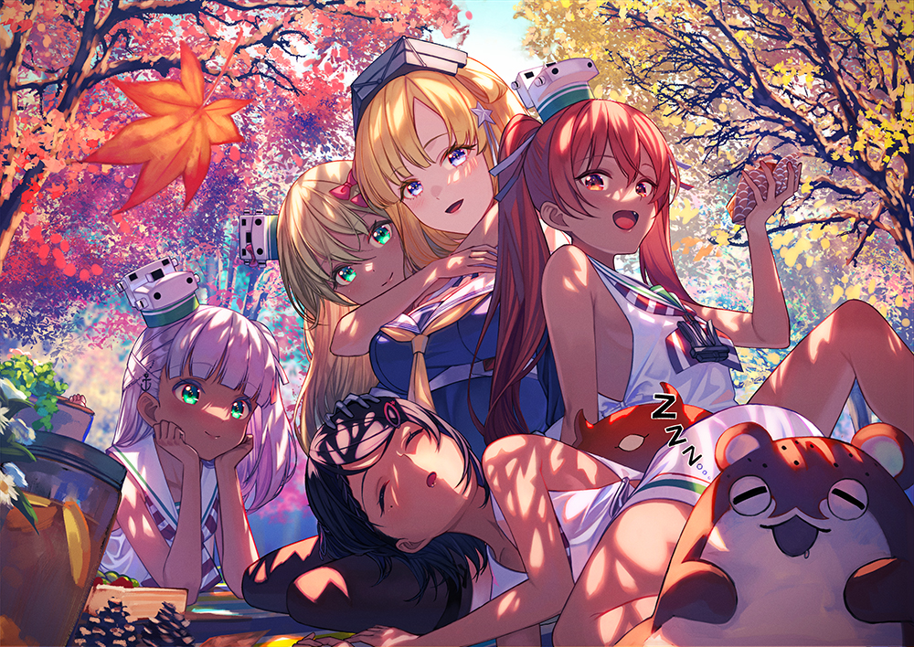 1other 5girls anchor_hair_ornament anchor_ornament autumn_leaves black_hair blonde_hair blue_shirt bokukawauso bow breasts brown_eyes brown_hair closed_eyes commentary_request day double_bun dress fletcher_(kancolle) flower food grecale_(kancolle) green_eyes hair_bun hair_ornament hair_ribbon ice_cream kantai_collection large_breasts leaf libeccio_(kancolle) long_hair low-cut_armhole lying maestrale_(kancolle) mascot mole mole_under_eye multiple_girls neckerchief odd_one_out one_side_up otter outdoors petals picnic picnic_basket pink_bow ribbon sailor_collar sailor_dress scirocco_(kancolle) shirt short_hair side-tie_dress sitting skirt sleeping sleeveless sleeveless_dress star_(symbol) star_hair_ornament striped_neckerchief tan tree twintails unowen wavy_hair white_dress white_hair white_ribbon white_sailor_collar white_skirt yellow_neckerchief zzz