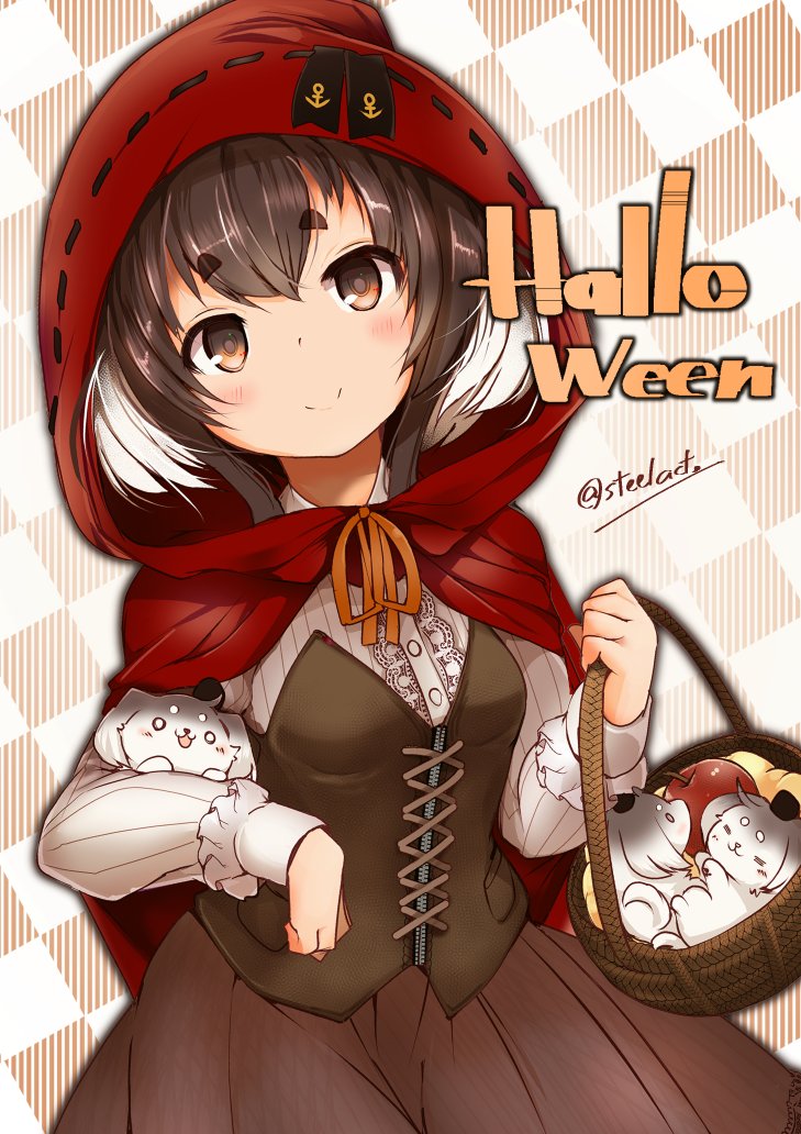 1girl anchor_symbol apple baby_animal basket black_hair breasts brown_background brown_eyes brown_skirt cape capelet checkered_background cloak corset cosplay dog food frilled_sleeves frills fruit hair_between_eyes halloween holding holding_basket hood hooded_cape kantai_collection little_red_riding_hood_(fairy_tale) little_red_riding_hood_(fairy_tale_character) little_red_riding_hood_(fairy_tale_character)_(cosplay) long_skirt long_sleeves looking_at_viewer nijou_katame picnic_basket puppy red_capelet red_cloak red_hood shirt short_hair short_hair_with_long_locks skirt small_breasts smile solo tokitsukaze_(kancolle) twitter_username white_background white_shirt