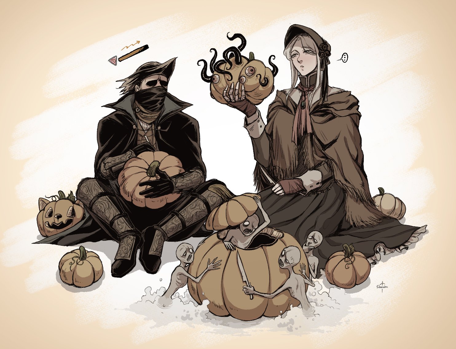 1boy 1girl ascot bloodborne bonnet boots capelet cloak coat damien_v_grimm doll_joints dress gloves halloween hat hunter_(bloodborne) jack-o'-lantern joints knife long_sleeves mask messengers_(bloodborne) mouth_mask plain_doll pumpkin short_hair sitting tentacles tricorne white_hair