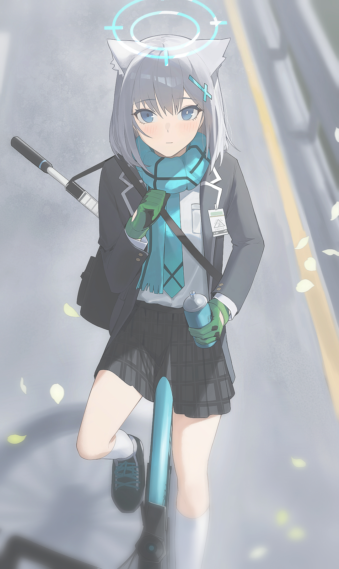 1girl animal_ear_fluff animal_ears assault_rifle bicycle black_jacket black_shoes black_skirt blue_archive blue_eyes blue_necktie blue_scarf blurry blurry_background bottle commentary darkzmonsty day depth_of_field english_commentary fringe_trim gloves green_gloves grey_hair gun hair_between_eyes hair_ornament halo highres holding holding_bottle jacket looking_at_viewer necktie open_clothes open_jacket outdoors petals plaid_clothes plaid_skirt pleated_skirt railing rifle scarf shiroko_(blue_archive) shirt shoes sig_sauer_556 skirt socks solo water_bottle weapon white_shirt white_socks