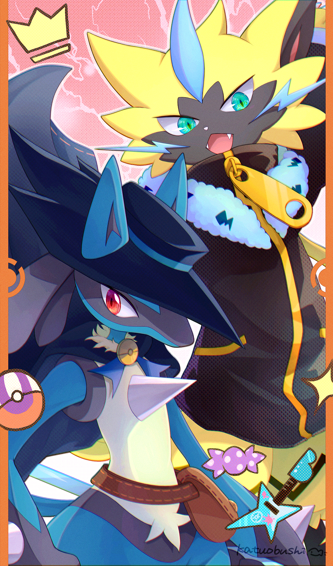 belt black_headwear black_jacket brown_belt clothed_pokemon commentary_request fangs gen_4_pokemon gen_7_pokemon green_eyes highres jacket katuobushi04 legendary_pokemon looking_at_viewer lucario lucario_(costume_party) mythical_pokemon nintendo open_mouth pokemon pokemon_unite pouch red_eyes tongue zeraora zeraora_(band) zipper_pull_tab