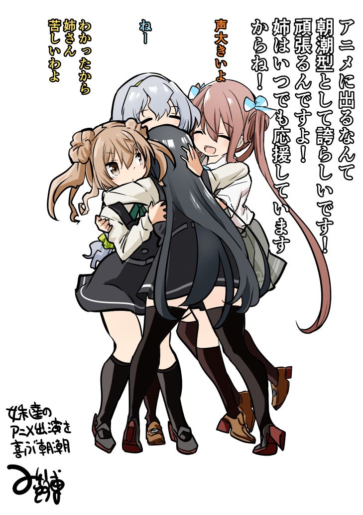 4girls asagumo_(kancolle) asashio_(kancolle) asashio_kai_ni_(kancolle) black_dress black_hair black_socks black_thighhighs brown_hair closed_eyes collared_shirt commentary_request double_bun dress dress_shirt grey_hair grey_skirt hair_bun hair_ribbon hug kantai_collection kimura_mitsuhiro light_brown_hair long_hair michishio_(kancolle) michishio_kai_ni_(kancolle) multiple_girls pinafore_dress ribbon shirt short_twintails simple_background skirt sleeveless sleeveless_dress socks thighhighs translation_request twintails wavy_hair white_background white_shirt yamagumo_(kancolle)