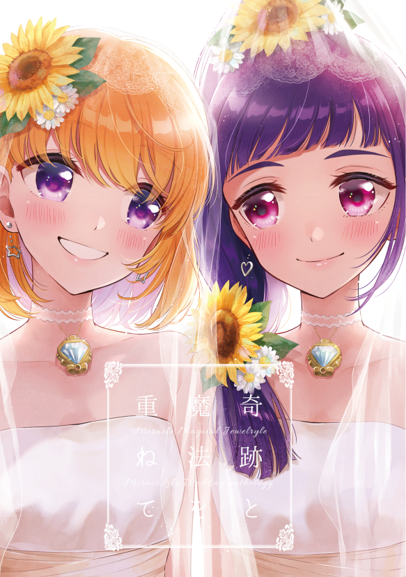 2girls asahina_mirai blonde_hair blush choker closed_mouth collarbone dress earrings flower gem grin hair_flower hair_ornament hair_over_shoulder head_tilt heart heart_earrings izayoi_liko jewelry kononkono long_hair mahou_girls_precure! multiple_girls ponytail precure purple_eyes purple_hair red_eyes short_hair smile star_(symbol) star_earrings strapless strapless_dress veil wedding_dress white_choker white_dress white_flower white_gem yellow_flower