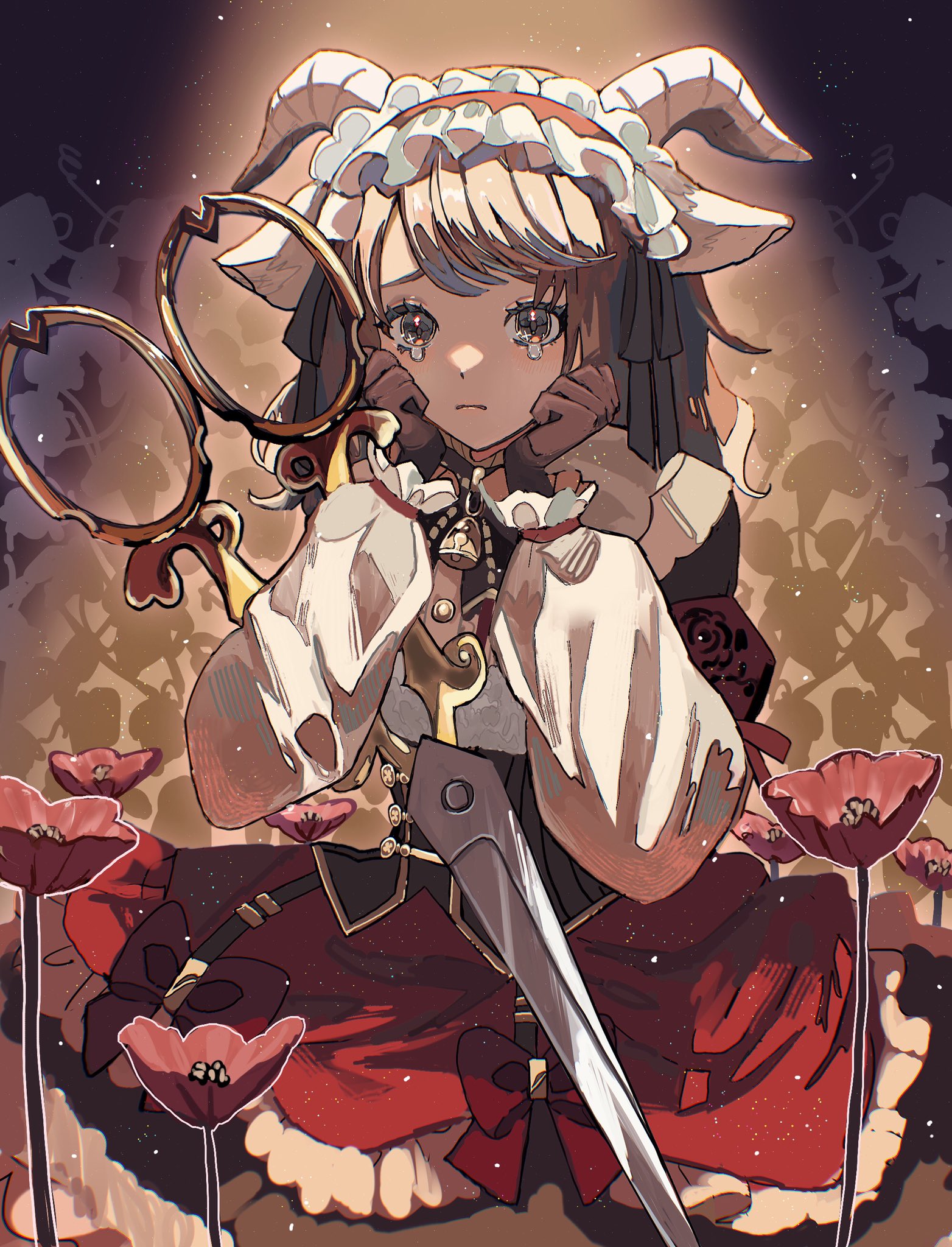 1girl animal_ears black_corset bow brown_gloves brown_hair corset crying detached_sleeves flower frown gloves goat_ears goat_horns hairband hanasato_minori highres holding holding_scissors horns ksan_tb light_particles lolita_hairband long_sleeves looking_at_viewer medium_hair poppy_(flower) project_sekai puffy_long_sleeves puffy_sleeves red_bow red_flower red_skirt scissors shirt sitting skirt solo tears white_shirt zekkyou!?_ookami_no_mori_e_youkoso!_(project_sekai)