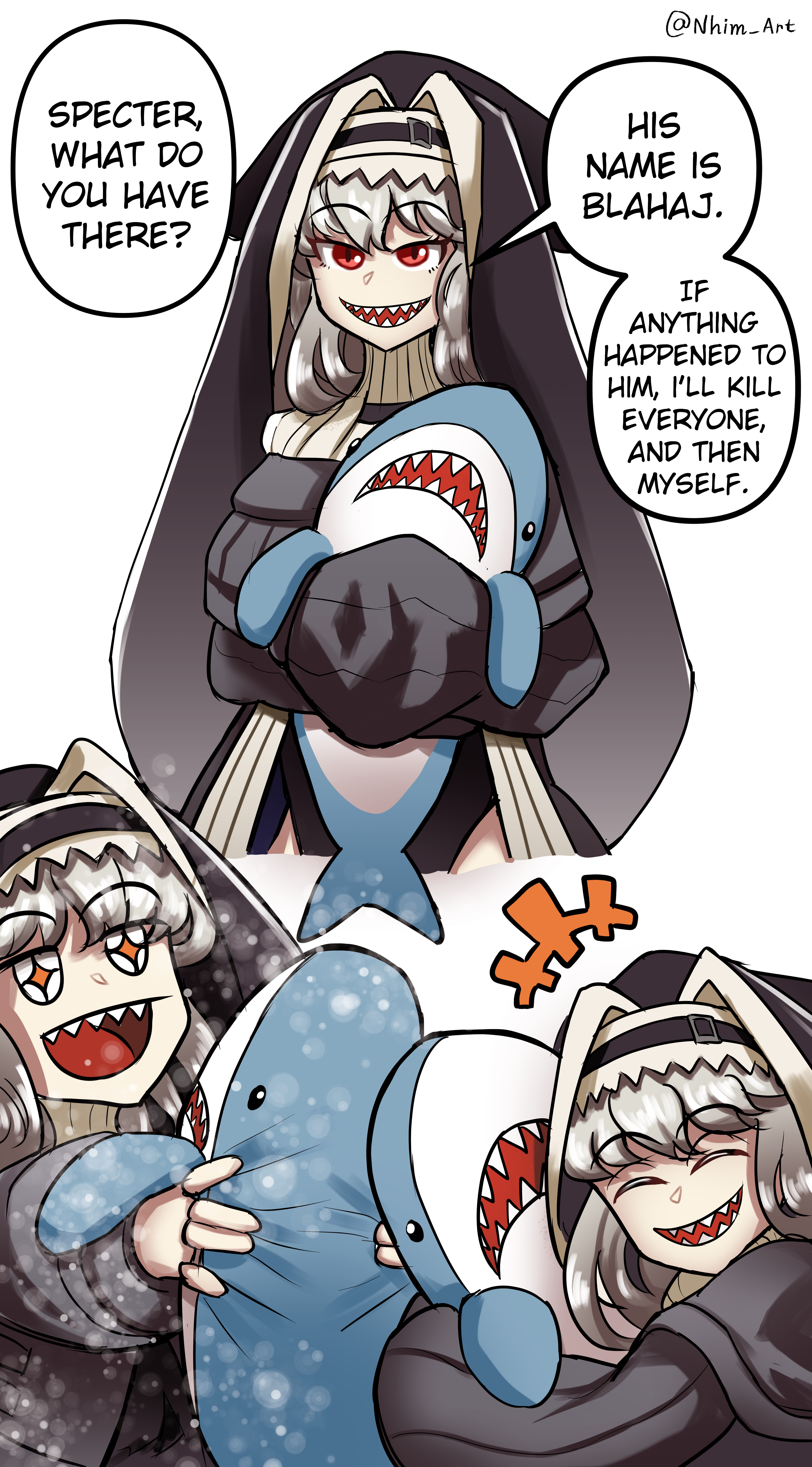 +++ +_+ 1girl :d ^_^ absurdres arknights black_dress black_headwear closed_eyes comic dress english_text grey_hair habit highres holding holding_stuffed_toy ikea_shark meme multiple_views nhim nun nun_headdress open_mouth sharp_teeth simple_background smile specter_(arknights) speech_bubble stuffed_animal stuffed_shark stuffed_toy teeth twitter_username white_background