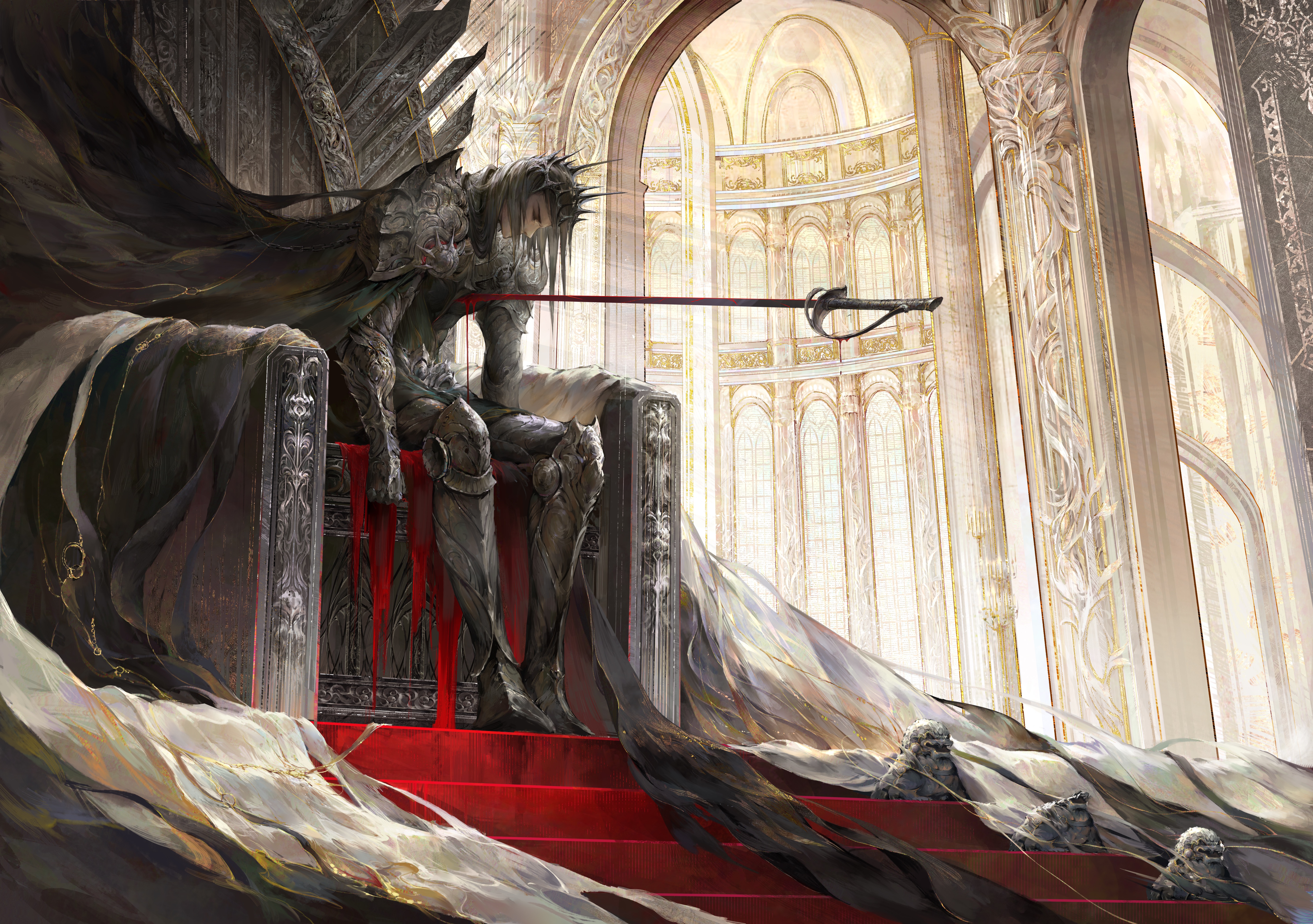 1boy absurdres arch armor black_armor black_hair blood bloody_weapon cape chinese_commentary closed_eyes commentary_request corpse deep_wound full_armor highres indoors injury long_hair lord_of_the_mysteries lunara on_throne pillar planted planted_sword planted_weapon sculpture sitting solomon_(lord_of_the_mysteries) stairs sunlight sword throne weapon window