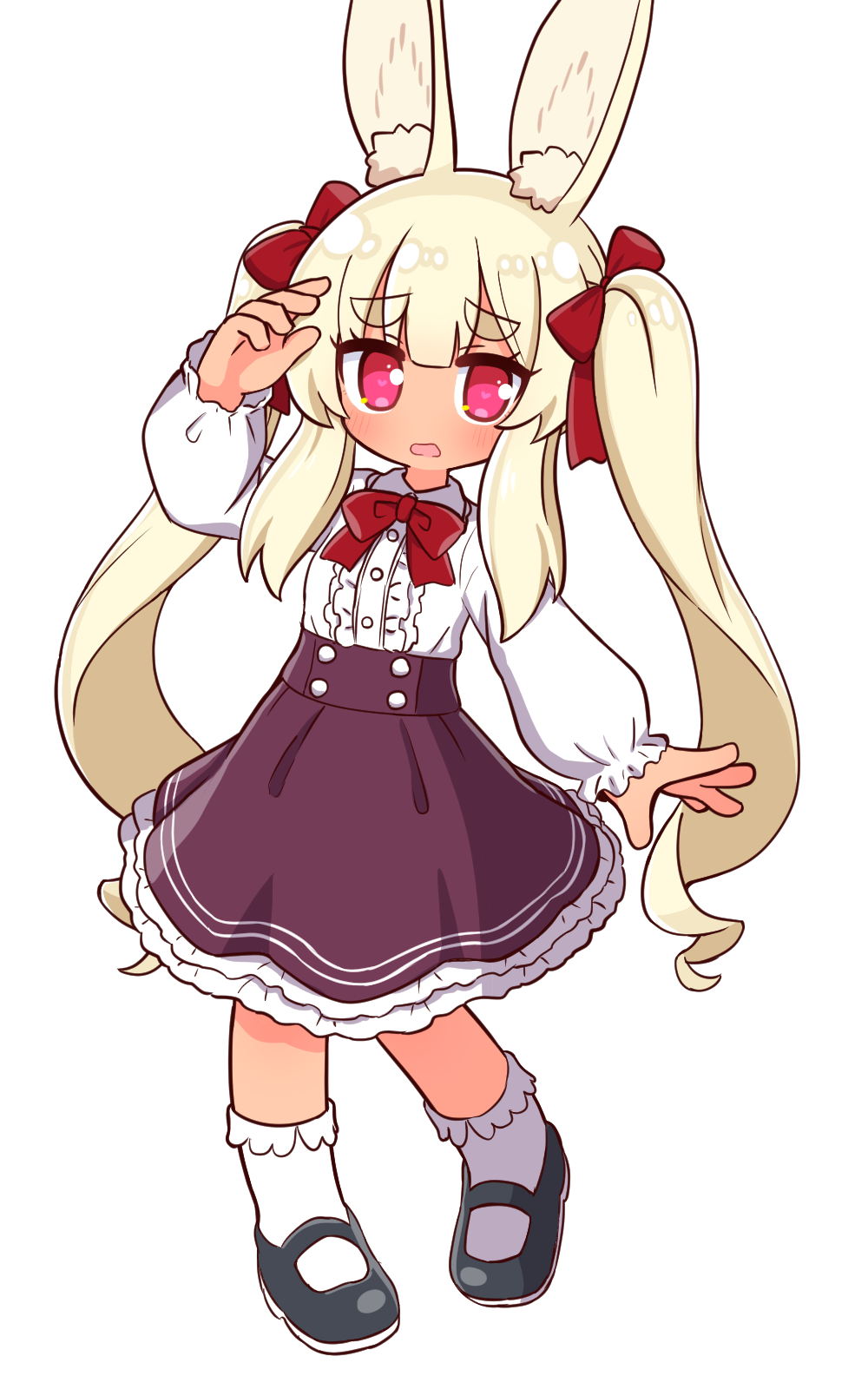 1girl animal_ear_fluff animal_ears arm_up black_shoes blonde_hair blush bobby_socks bow center_frills collared_shirt etrian_odyssey frills full_body hair_between_eyes hair_bow heart heart-shaped_pupils highres long_hair long_sleeves looking_at_viewer mary_janes masurao_(sekaiju) masurao_2_(sekaiju) naga_u parted_lips puffy_long_sleeves puffy_sleeves purple_skirt rabbit_ears red_bow red_eyes sekaiju_no_meikyuu sekaiju_no_meikyuu_5 shirt shoes short_eyebrows simple_background skirt sleeves_past_wrists socks solo standing standing_on_one_leg symbol-shaped_pupils thick_eyebrows twintails very_long_hair wavy_mouth white_background white_shirt white_socks