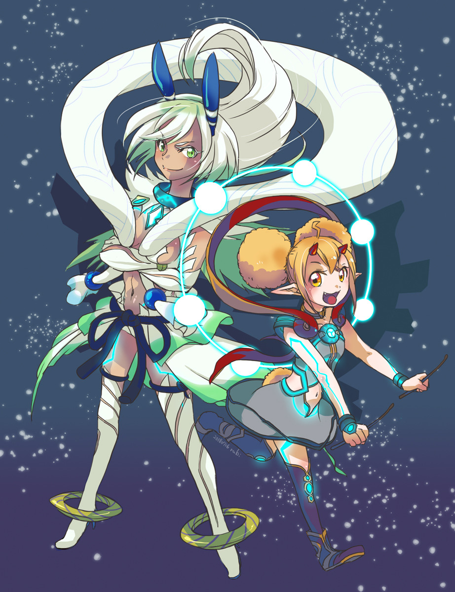 2girls ahoge bare_shoulders black_footwear black_thighhighs blonde_hair boots clothing_cutout crossed_arms dark-skinned_female dark_skin double_bun dress electra_(xenoblade) full_body green_eyes hair_bun highres horns multiple_girls navel navel_cutout open_mouth power_connection revealing_clothes rubi_nemesis short_hair sleeveless sleeveless_dress smile tattoo thigh_boots thighhighs white_footwear white_hair xenoblade_chronicles_(series) xenoblade_chronicles_2 yellow_eyes zenobia_(xenoblade)