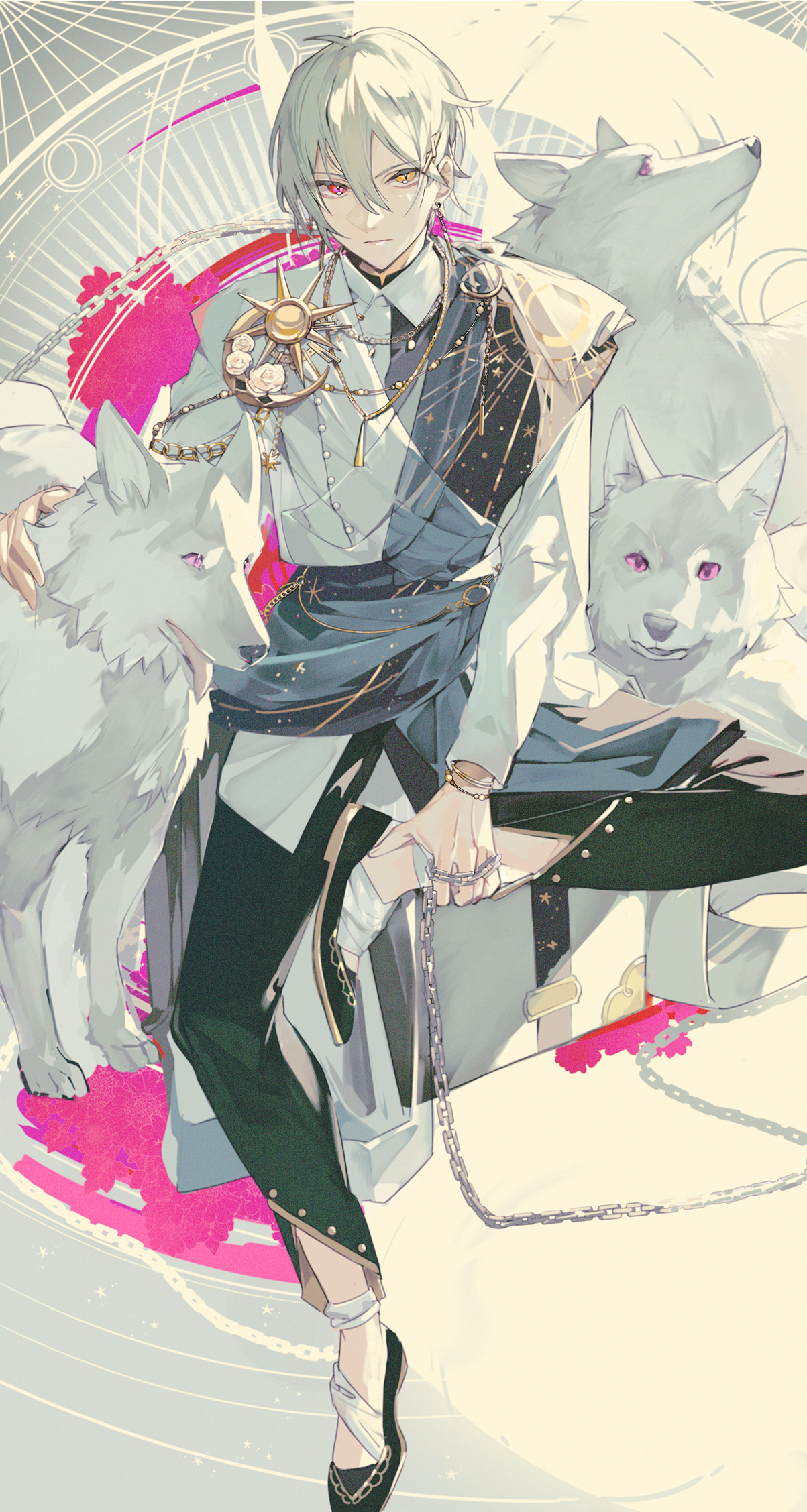 1boy chain chain_necklace closed_mouth clothing_request commentary dot37_m grey_background heavy_breathing heterochromia highres looking_at_viewer mahoutsukai_no_yakusoku male_focus necklace owen_(mahoutsukai_no_yakusoku) pink_eyes serious short_hair sitting solo tagme white_hair white_wolf wolf yellow_eyes