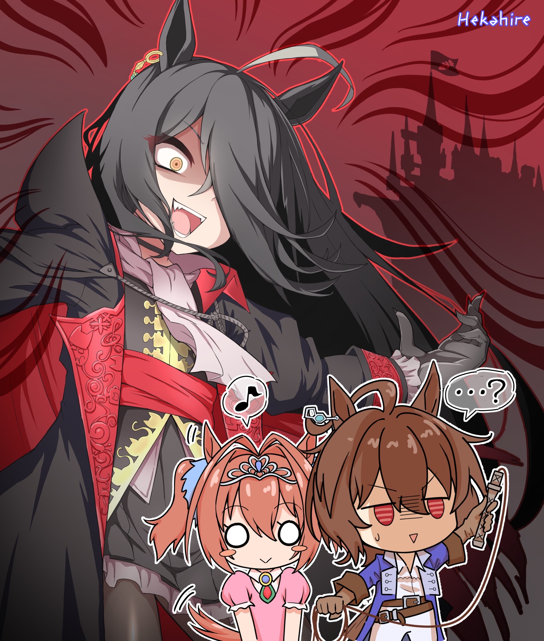 ... 3girls aged_down agnes_tachyon_(umamusume) ahoge alternate_hair_length alternate_hairstyle animal_ears artist_name ascot black_cloak black_hair blue_coat blush_stickers castle castlevania:_rondo_of_blood castlevania_(series) chibi child cloak coat commentary_request cosplay daiwa_scarlet_(umamusume) dracula_(castlevania) dracula_(castlevania)_(cosplay) dress earrings eighth_note gloves grey_hair hair_between_eyes hair_intakes hair_over_one_eye hekahire_isurus high_collar highres holding holding_whip horse_ears horse_girl horse_tail jewelry leather leather_gloves long_bangs manhattan_cafe_(umamusume) motion_lines multiple_girls musical_note o_o orange_eyes pink_dress red_eyes richter_belmont richter_belmont_(cosplay) sharp_teeth shorts sidelocks single_earring spoken_ellipsis spoken_musical_note tail teeth tiara triangle_mouth twintails umamusume white_ascot