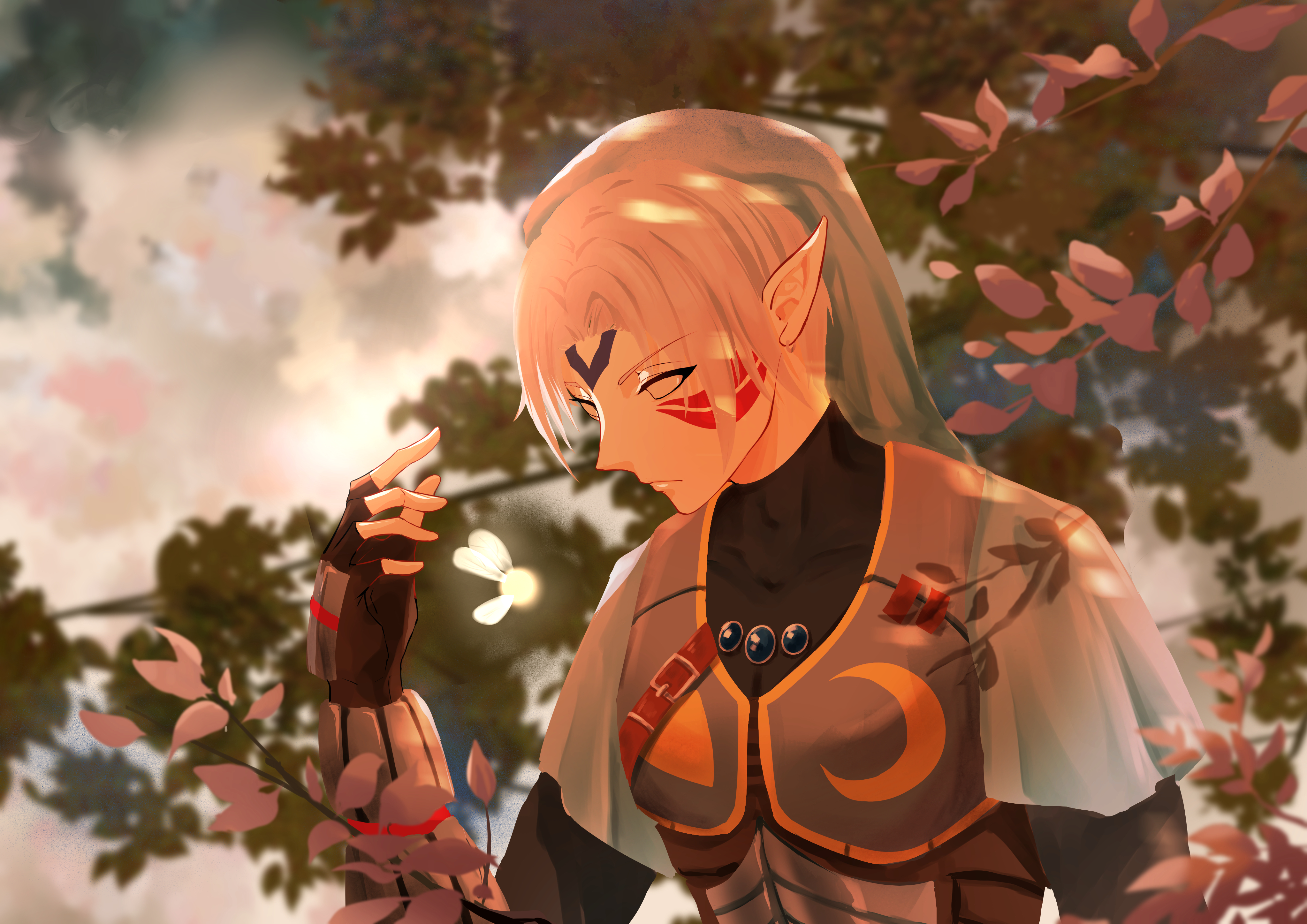 1boy absurdres armor black_gloves blue_gem blurry blurry_background branch chest_jewel cloud cloudy_sky crescent crescent_print facial_mark facial_tattoo fairy fierce_deity fingerless_gloves fusion gem gloves highres kana_(kkk021109) leaves link male_focus mask nintendo no_pupils official_alternate_costume official_alternate_eye_color official_alternate_hair_color outdoors pointy_ears possessed possession sky tattoo the_legend_of_zelda the_legend_of_zelda:_majora's_mask tree triangle triangle_print upper-body white_eyes white_hair