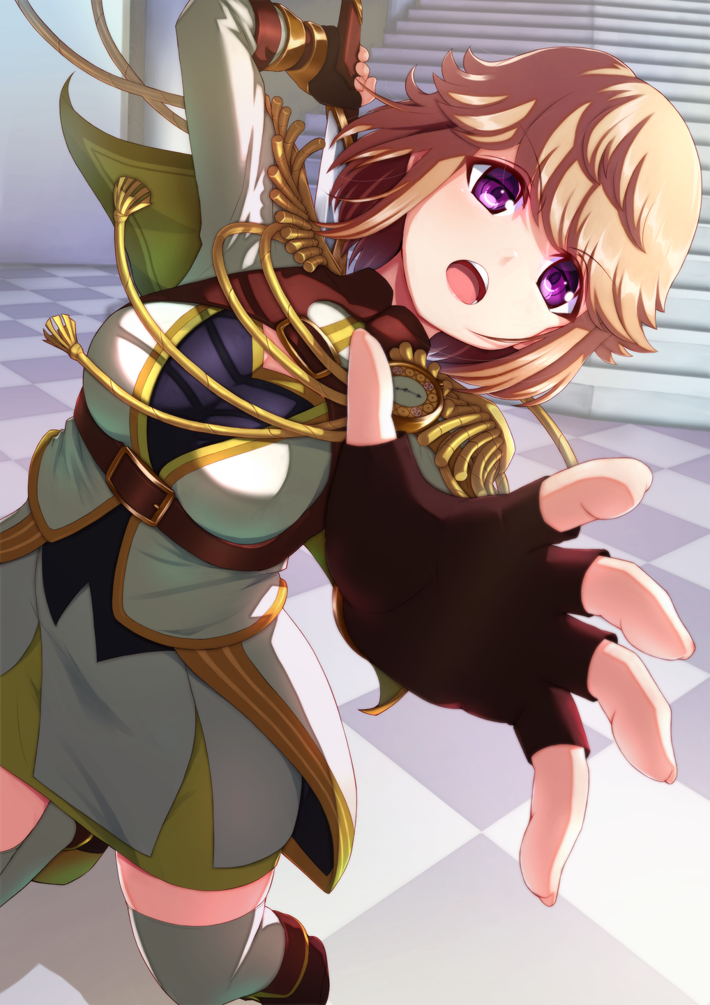 1girl aiguillette analog_clock arm_up belt belt_buckle black_shirt boots breasts brown_belt brown_boots brown_gloves buckle capelet checkered_floor chest_harness clock commentary_request epaulettes fingerless_gloves foot_out_of_frame foreshortening gloves hand_up harness highres hiraken holding holding_behind_back holding_sword holding_weapon holding_weapon_behind_back incoming_attack indoors jacket kobato_ryoko layered_skirt leaning_to_the_side leg_up light_brown_hair long_sleeves looking_at_viewer medium_breasts miniskirt open_mouth outstretched_arm pillar purple_eyes reaching reaching_towards_viewer shirt short_hair shoujo_kageki_revue_starlight shoujo_kageki_revue_starlight_-re_live- skirt solo stairs standing standing_on_one_leg sword teeth thighhighs thighhighs_under_boots underbust upper_teeth_only v-shaped_eyebrows weapon white_jacket white_skirt white_thighhighs yellow_capelet yellow_skirt zettai_ryouiki
