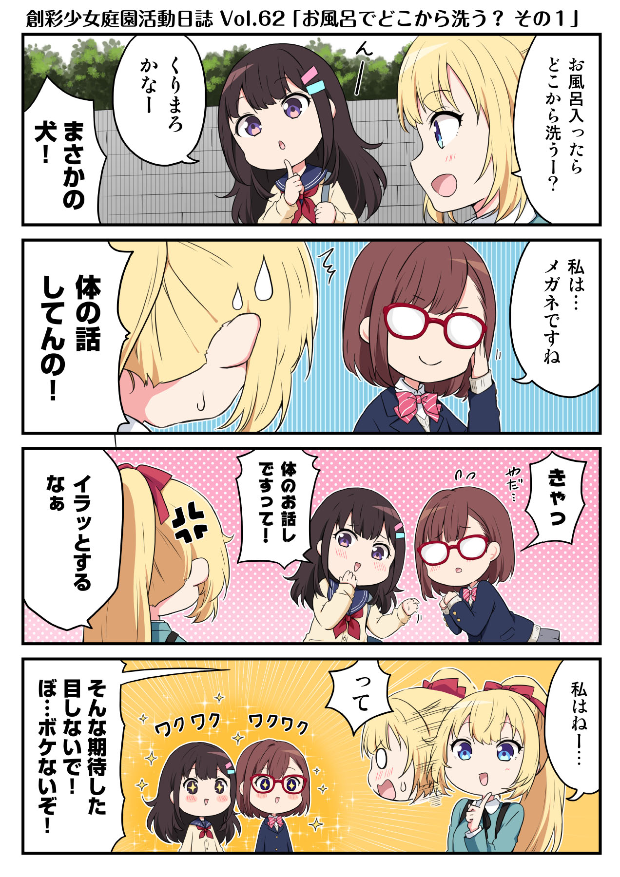 3girls 4koma adjusting_eyewear afterimage anger_vein asymmetrical_bangs bag blazer blonde_hair blue_eyes blue_jacket blue_sailor_collar blush bow bowtie brown_hair collared_shirt comic finger_to_own_chin flying_sweatdrops glasses green_jacket grey_skirt hair_ornament hairclip highres index_finger_raised jacket long_hair long_sleeves motion_lines multiple_girls neckerchief notice_lines official_art opaque_glasses open_mouth outdoors purple_eyes ragho_no_erika red-framed_eyewear red_bow red_bowtie red_neckerchief saeki_ritsuka sailor_collar school_bag school_uniform shirt short_hair skirt smile sousai_shoujo_teien sparkle striped_bow striped_bowtie striped_clothes sweatdrop sweater takanashi_koyomi wall white_shirt yuki_madoka