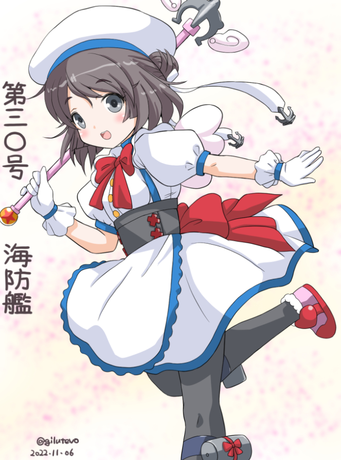 1girl alternate_costume anchor_ornament back_bow beret black_pantyhose bow bowtie character_name cowboy_shot double_bun dress gloves grey_eyes grey_hair hair_bun hat jack_(slaintheva) kaiboukan_no._30_(kancolle) kantai_collection magical_girl one-hour_drawing_challenge pantyhose red_bow red_bowtie running short_hair solo wand white_dress white_gloves white_hat