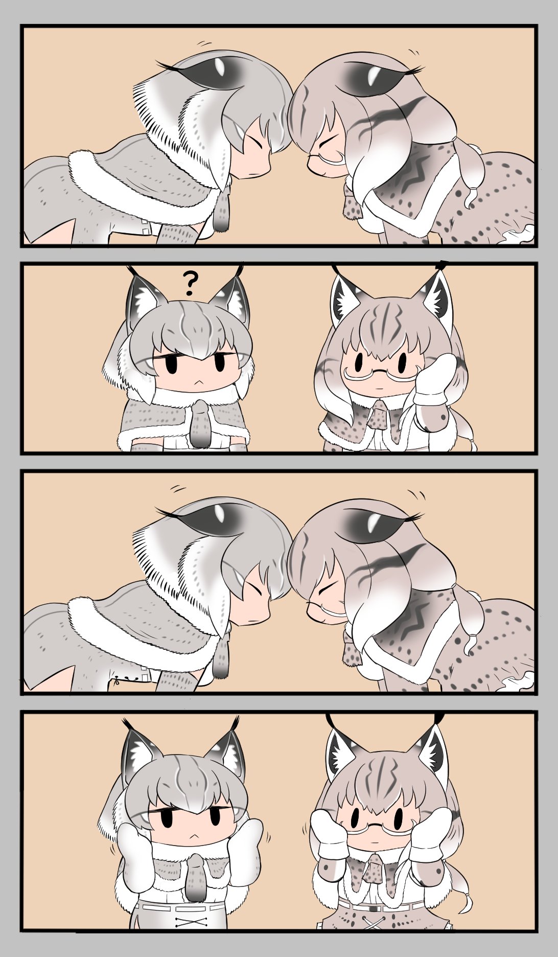 2girls ? adjusting_eyewear bokoboko_(pandagapanda1) bowing capelet cat_girl comic dual_persona eurasian_lynx_(kemono_friends) face-to-face forehead-to-forehead heads_together highres kemono_friends kemono_friends_3 lynx_ears lynx_tail multiple_girls necktie semi-rimless_eyewear silent_comic