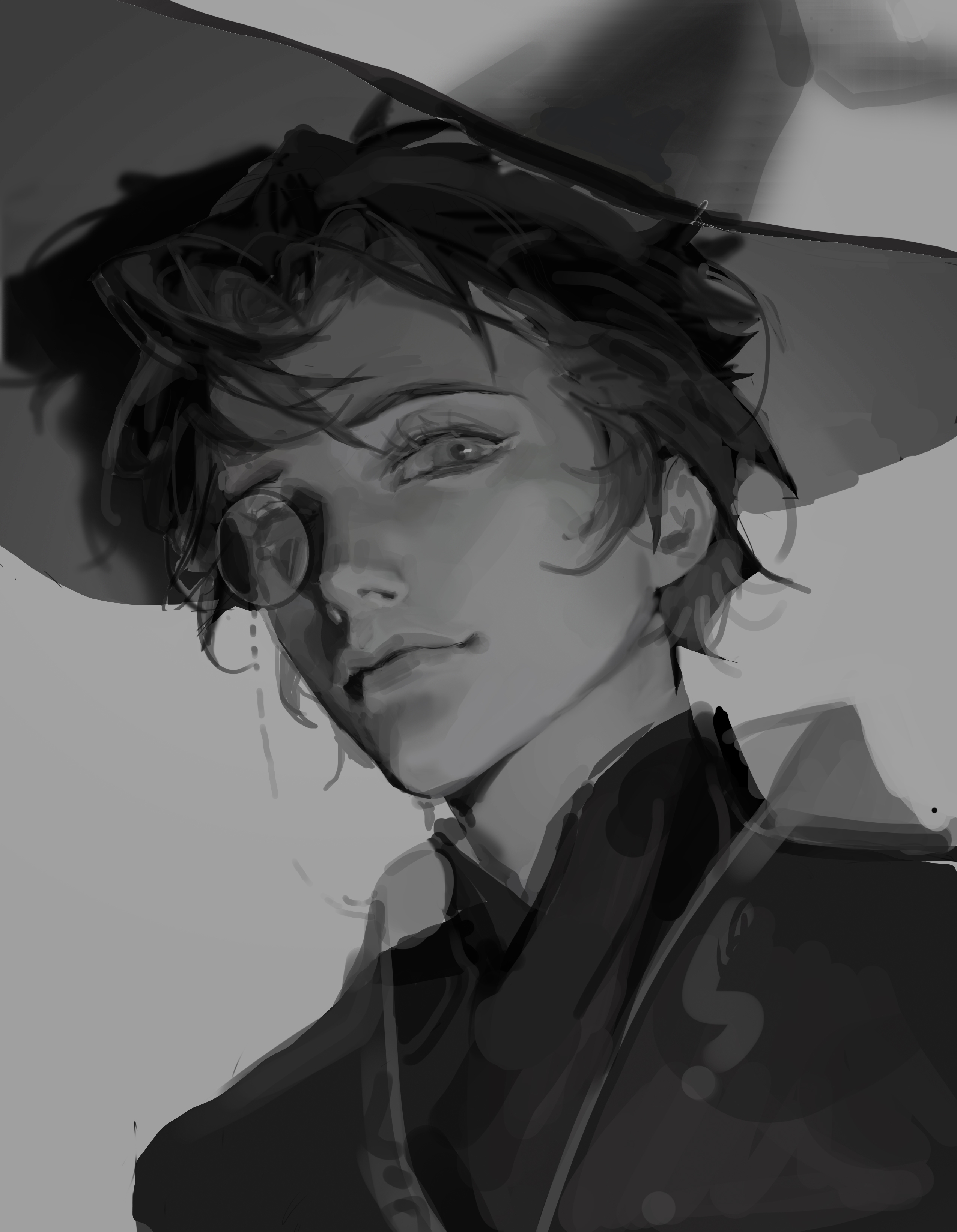 1boy absurdres amon_(lord_of_the_mysteries) black_hair black_robe blurry blurry_background chinese_commentary commentary_request grey_background greyscale hat highres lips looking_at_viewer lord_of_the_mysteries monochrome monocle robe short_hair simple_background smile solo tydjmdliyicygsey wizard_hat