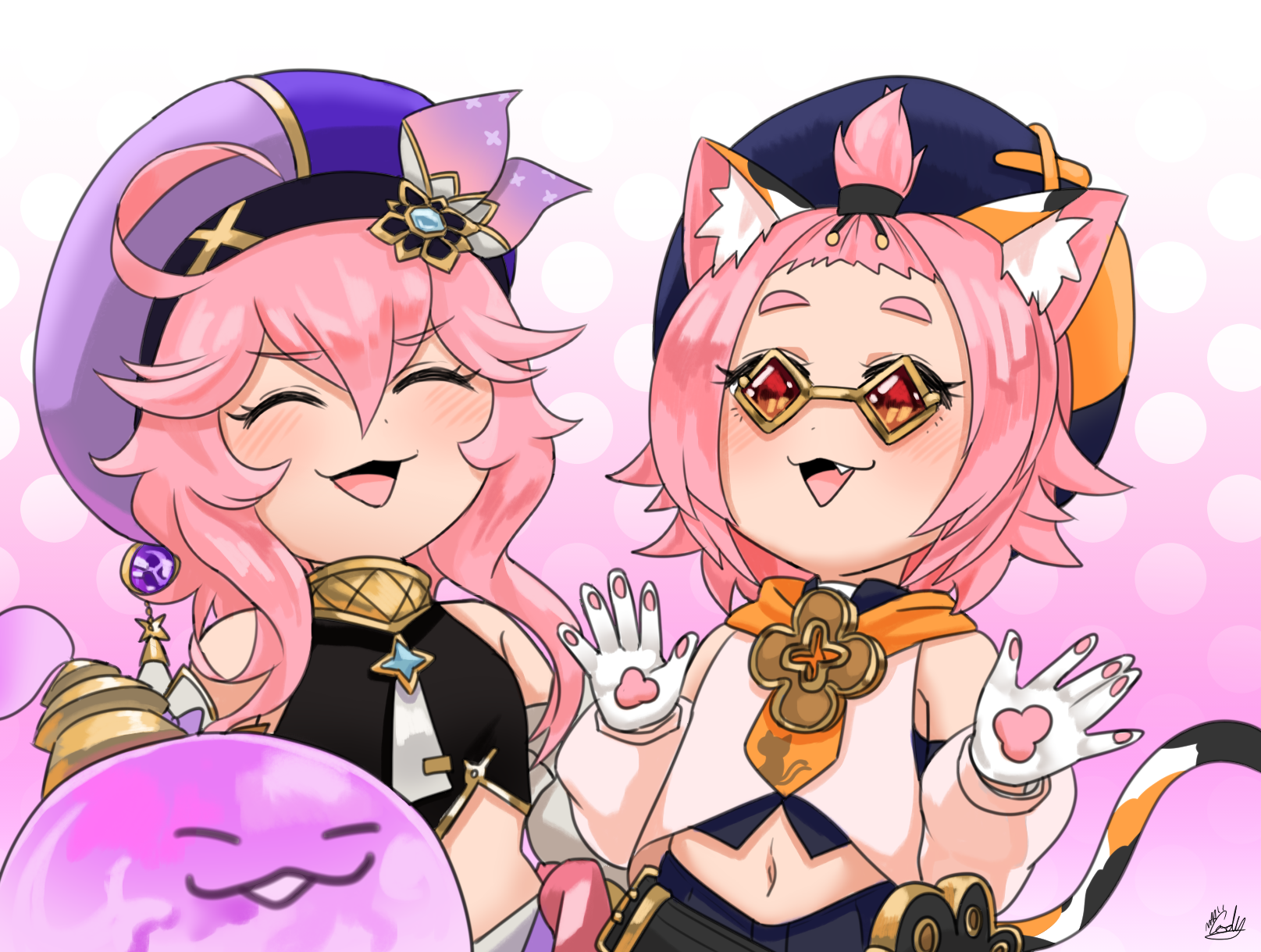 2girls :3 :d ^_^ ahoge animal_ears bangs_pinned_back bespectacled cat_ears cat_girl cat_tail closed_eyes commentary_request detached_sleeves diona_(genshin_impact) dori_(genshin_impact) forehead genshin_impact glasses gloves hair_between_eyes hat hat_ornament highres jinni_(genshin_impact) kodineun_haengbokhada long_sleeves looking_at_another midriff multiple_girls navel open_mouth paw_print pink_hair puffy_detached_sleeves puffy_sleeves short_hair short_hair_with_long_locks sidelocks simple_background smile sunglasses tail thick_eyebrows trait_connection white_gloves